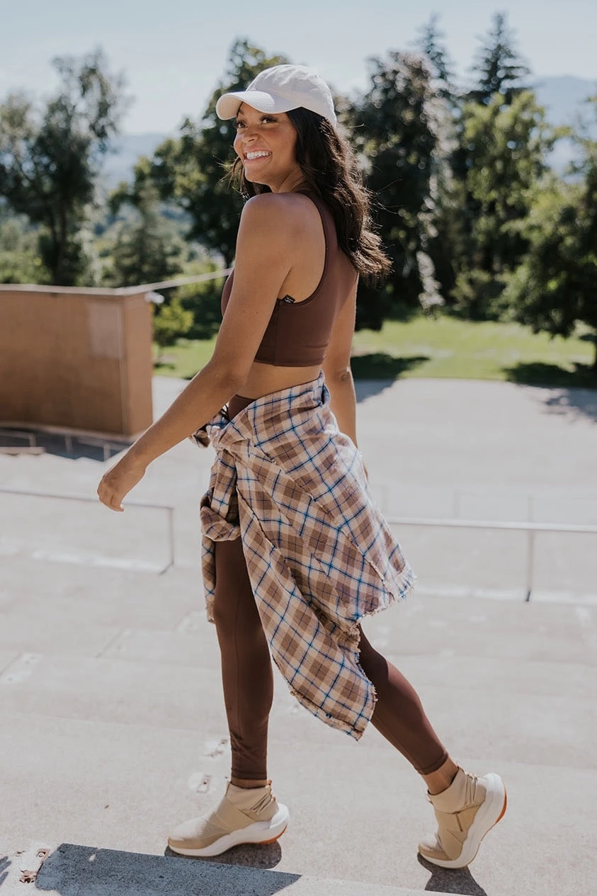 // paired with the all fenix rise racerback sports bra, the free people happy hour plaid shirt, + the sorel explorer defy mid sneaker