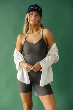This one is for all my sporty girls, the Ariana Ribbed Jumpsuit is the perfect piece for those bike short lovers. Featuring a mid-thigh short, a built-in bra with removable padding, and a v-neckline, this piece is perfect to wear to the gym or you can throw on your favorite graphic tee or pullover and run errands!