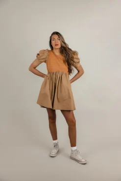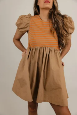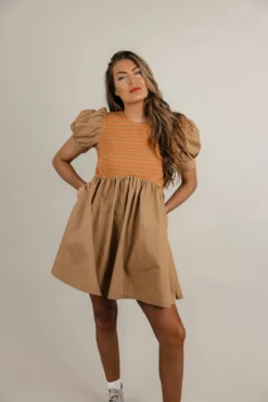 This dress is stealing the show over here at ROOLEE. Featuring playful puff sleeves and a striped knit bodice, this dress is the epitome of cute and trendy. The gathered waistband adds a flattering touch, making it perfect for any casual outing or special occasion.
