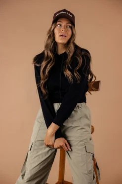 This simple black hoodie features a slightly cropped length and super soft material. It’s ideal to wear on your way to the gym or with your favorite pair of jeans.