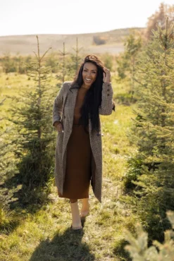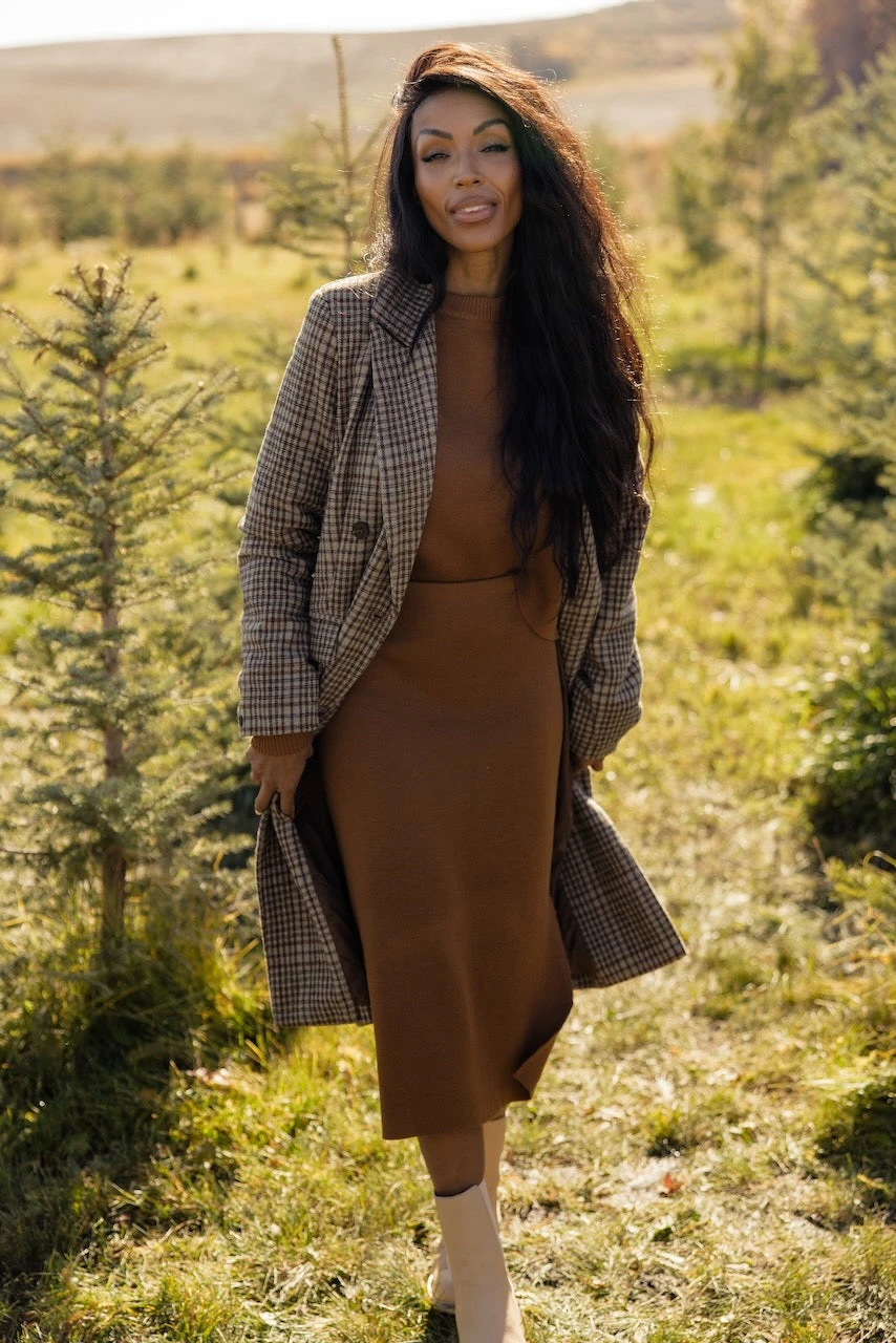 chocolate // paired with the brightly shining midi skirt, free people essential chelsea boots in antiquewhite, + lovely day double breasted plaid jacket