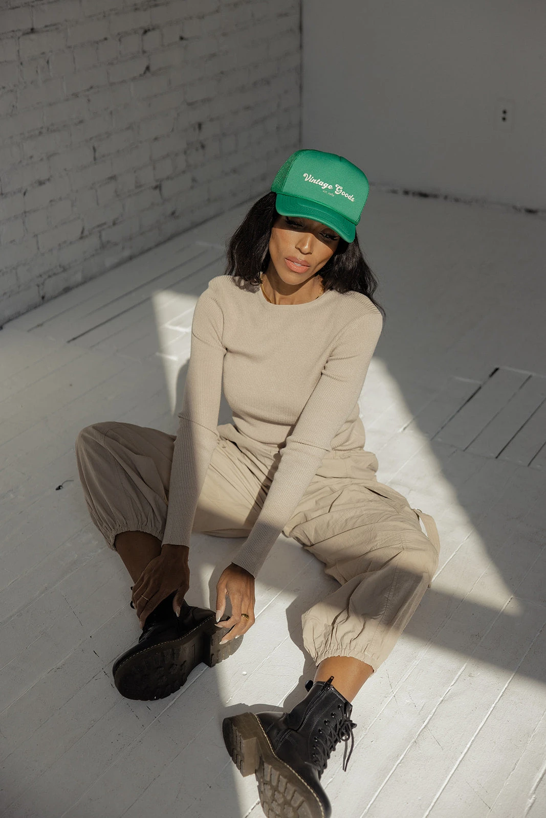 tan // paired with the vintage goods foam trucker hat, the stewart ribbed long sleeve + roolee elvis platform boots in black