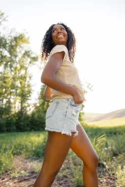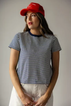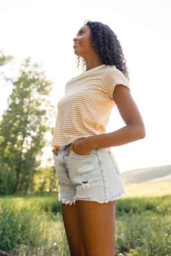 Everyone needs a classic striped tee and this one has some special features! It has a contrasting white collar and two fun colors to choose from. The Camp Rock Stripe Tee is easy to pair under your favorite Hot Shot Onesie, with your bootcut jeans, or your cutoff shorts. Everybody needs one of these tees!