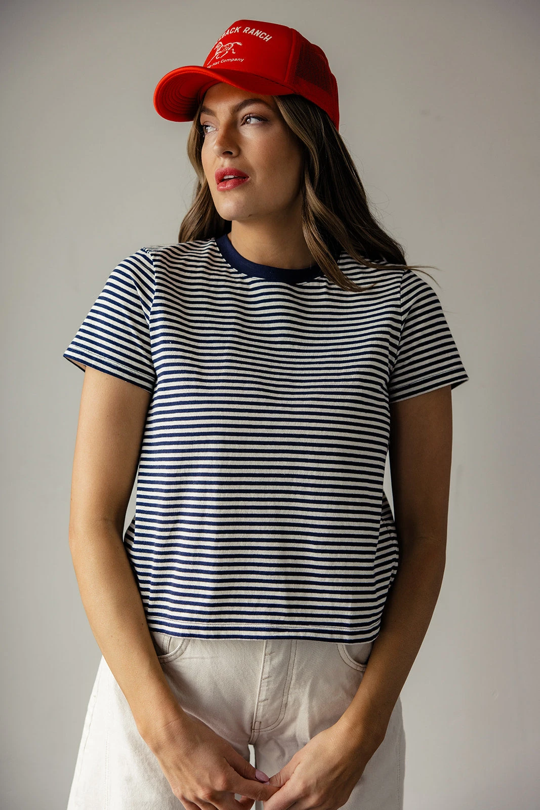 navy // paired with the saddleback ranch foam trucker hat + the free people lucky you mid rise barrel jeans