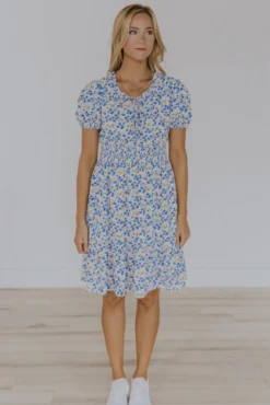 This beautiful blue dress is adorned with vibrant floral patterns and features charming puff sleeves + a feminine tie neckline that adds a touch of elegance. With a ruched waist, it offers a flattering silhouette that accentuates your curves.