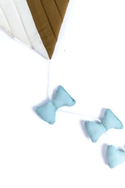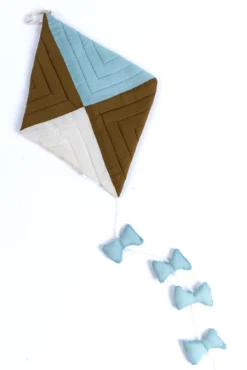 Take the cuteness level of your kid’s room to the highest heights with the adorable Cherry Tree Lane Kite hanging! This 100% cotton kite is sewn together in an adorable geometric pattern with four little blue bows trailing behind it. This kite is reversible so your little one can choose which color they like better and there is a loop at the top so you can hang it up easily! The sky is the limit with cute wall decor!