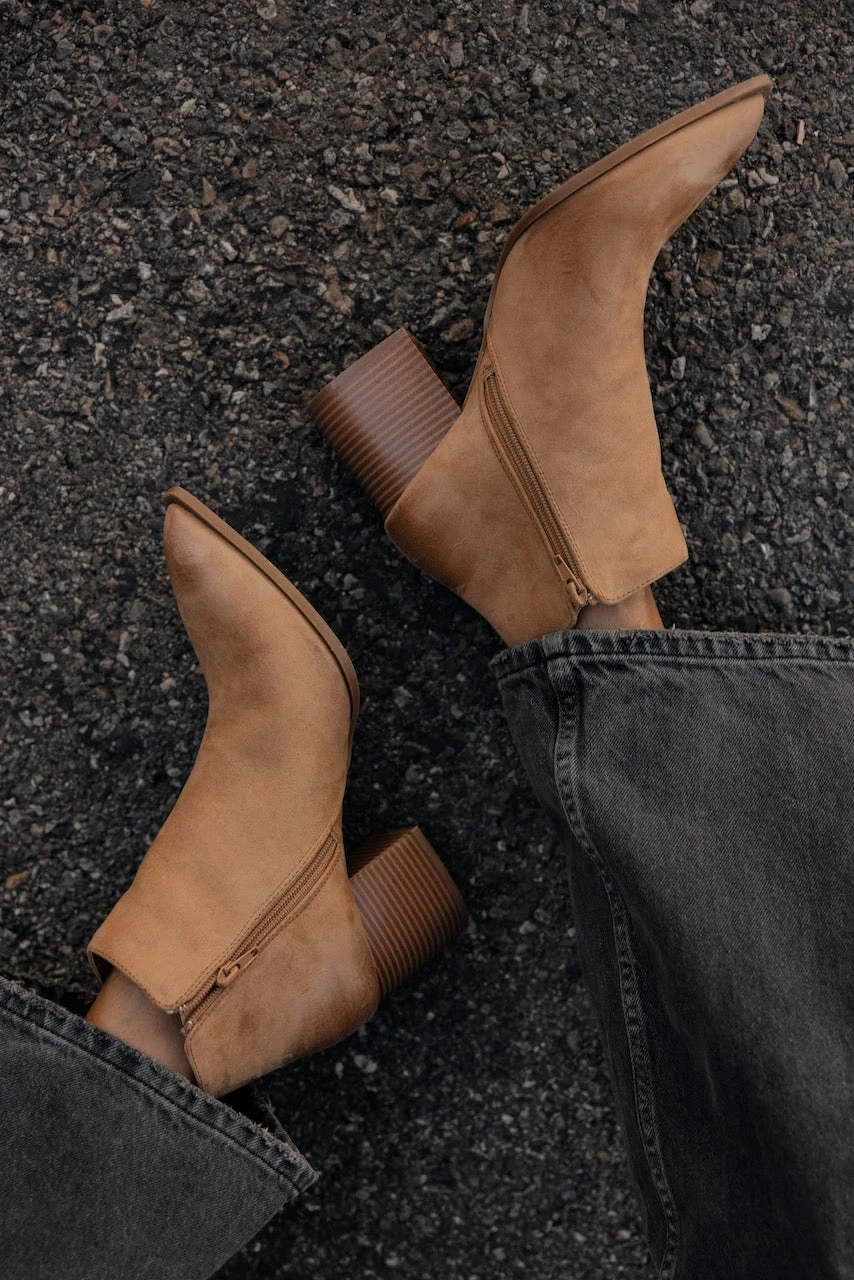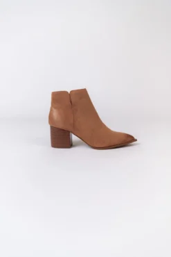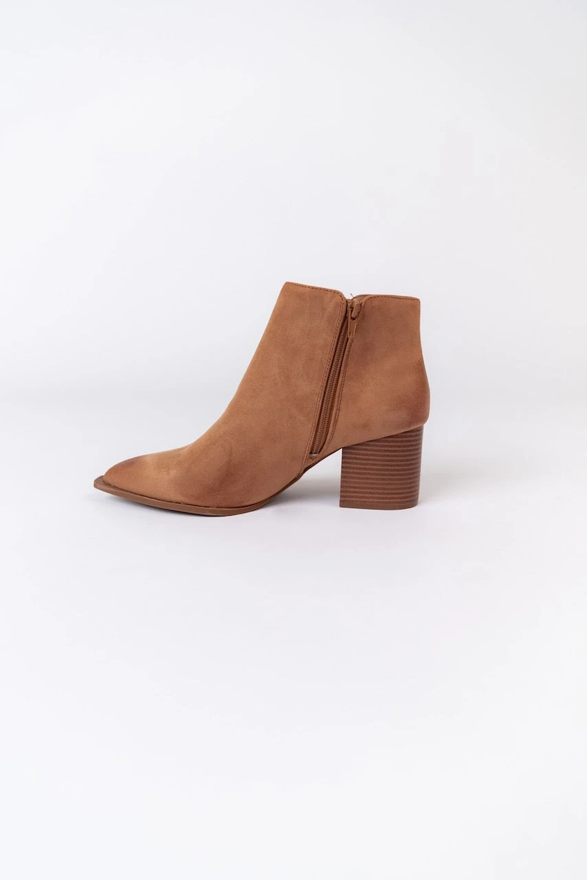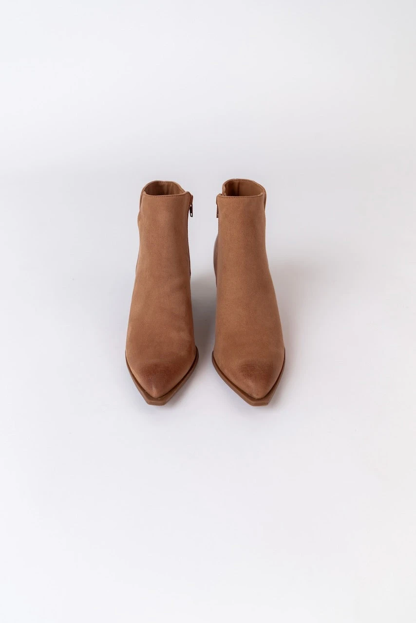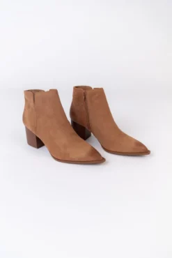 Crafted from suede buffed at the pointed toe, these heeled booties offer a sophisticated look. The zipper and v-cut at the ankle ensure an easy slip-on and an ideal fit, adding to their overall practicality. Step up your footwear game with these chic and versatile booties.