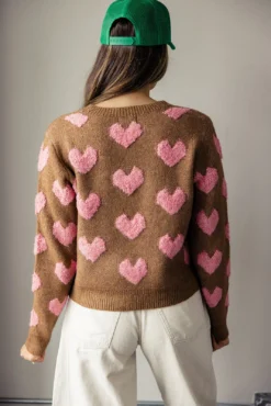 The perfect Valentine’s sweater is here! Act fast before it’s gone! Featuring cozy material, a chocolatey brown with pretty pink hearts, this sweater can be worn all year round for any special occasion!