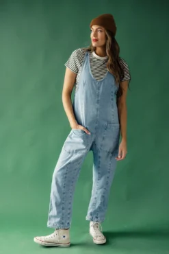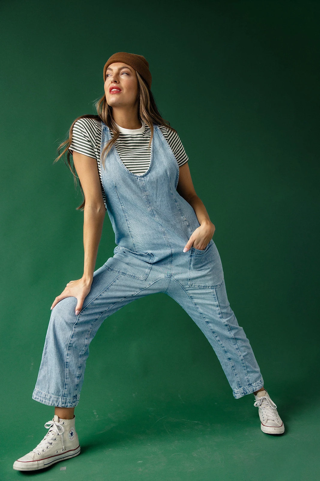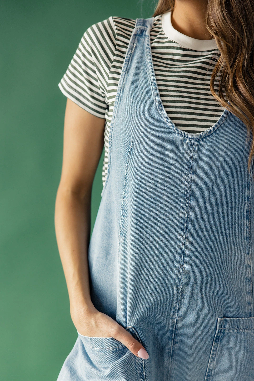 One-and-done and so simple, this denim jumpsuit is featured in a relaxed fit and cropped ankle-length style with harem legs and a low scoop neckline.