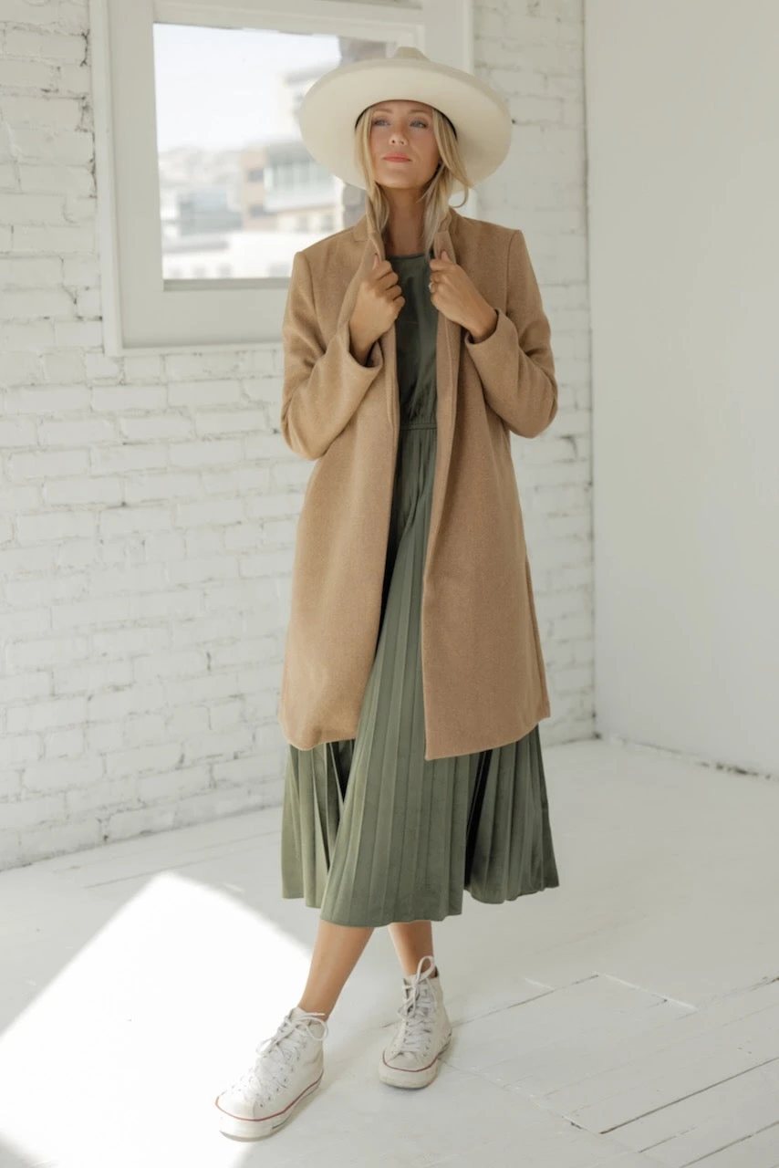 olivedrab // paired with roolee elfrida ankle strap heels in tan + fire and rain fleece coat