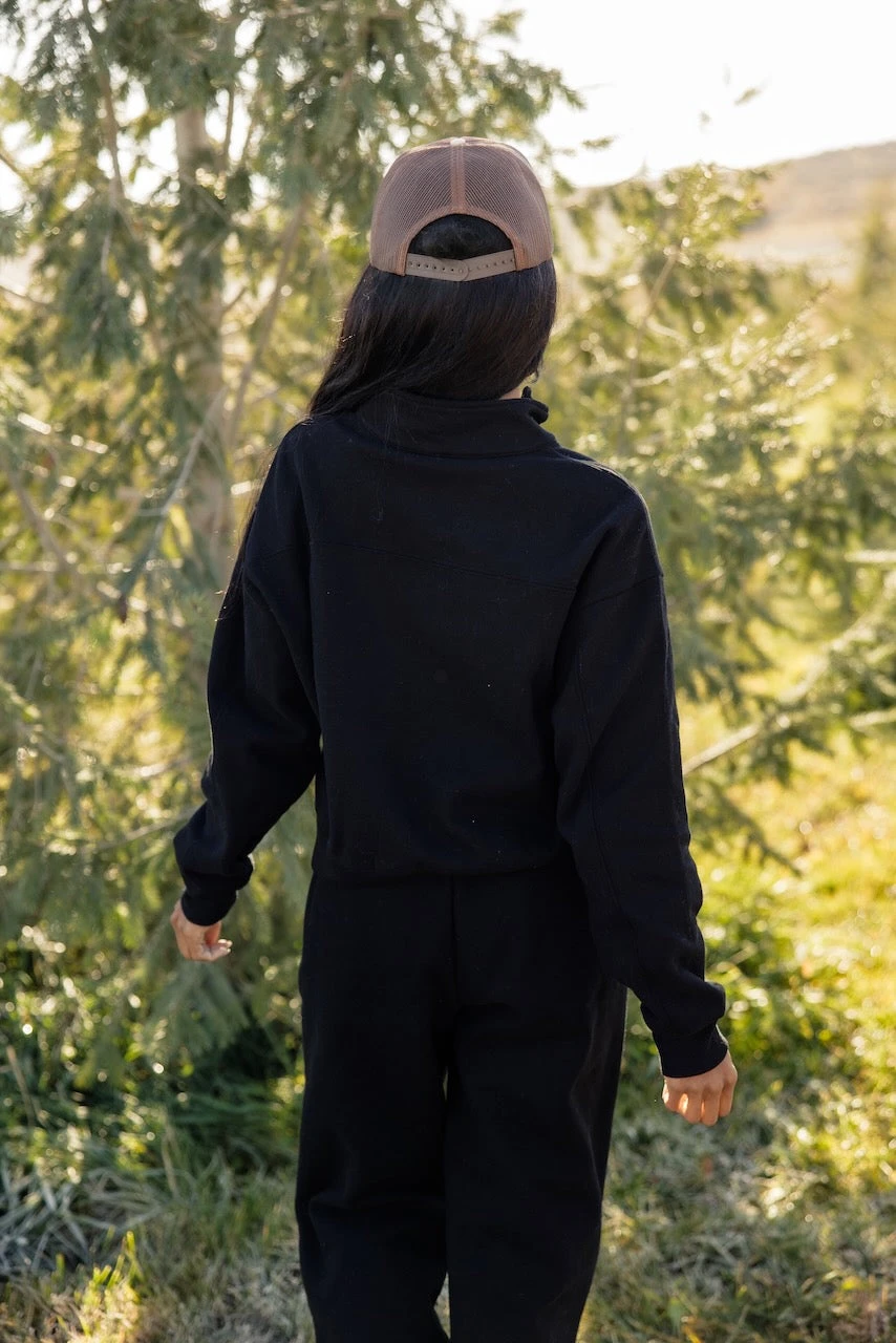black // paired with the after the storm wool shacket + chill foam trucker hat