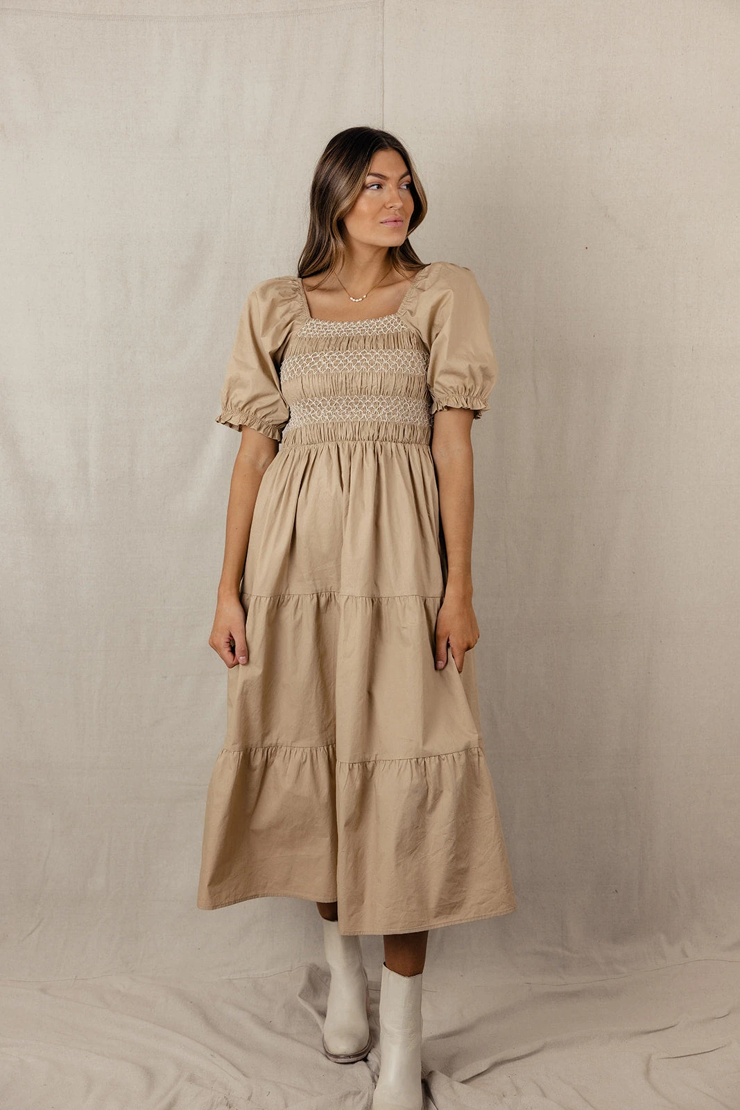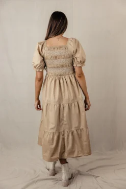 The Grayce features puff sleeves, a smocked bodice, and best of all, pockets! This dress can be worn all year long and dressed up or down with your favorite shoes. Emulate style and grace with this lovely taupe dress.