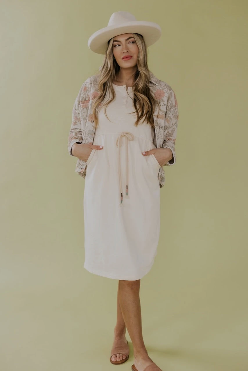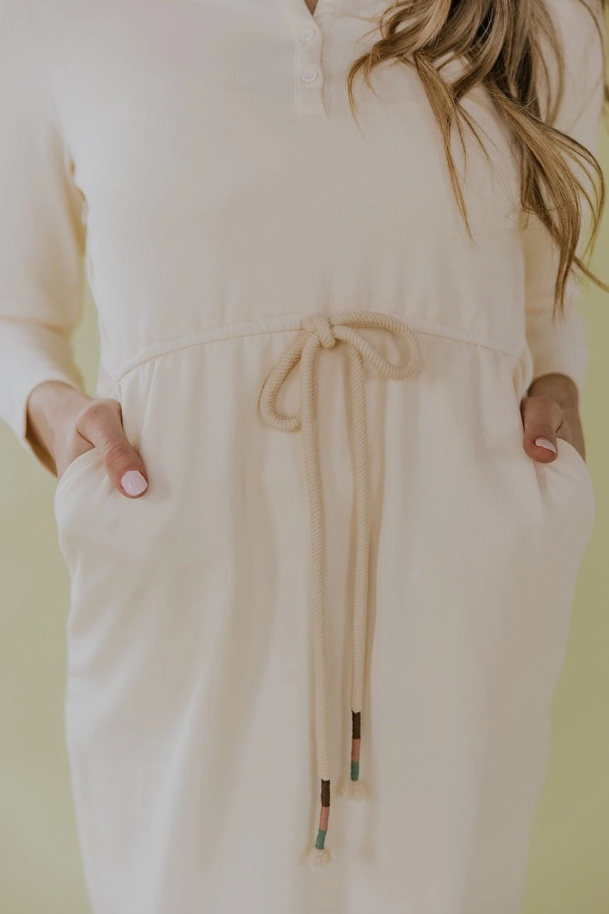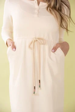 Looking for a stylish and functional dress that you can wear before and after pregnancy? This off-white nursing-friendly dress is perfect for you. With its long sleeves and henley collar, it offers both comfort and style. The drawstring waist accentuates your figure, while the nursing-friendly feature allows for easy breastfeeding access. Pair with your favorite accessories to personalize your look!