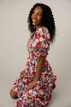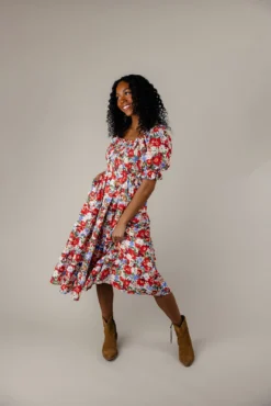 This dress features a Kaleidoscope of colors! With a square neckline, puff sleeves, + a smocked bodice, the Kaleidoscope Heart Square Neck Midi is one you won’t want to miss.