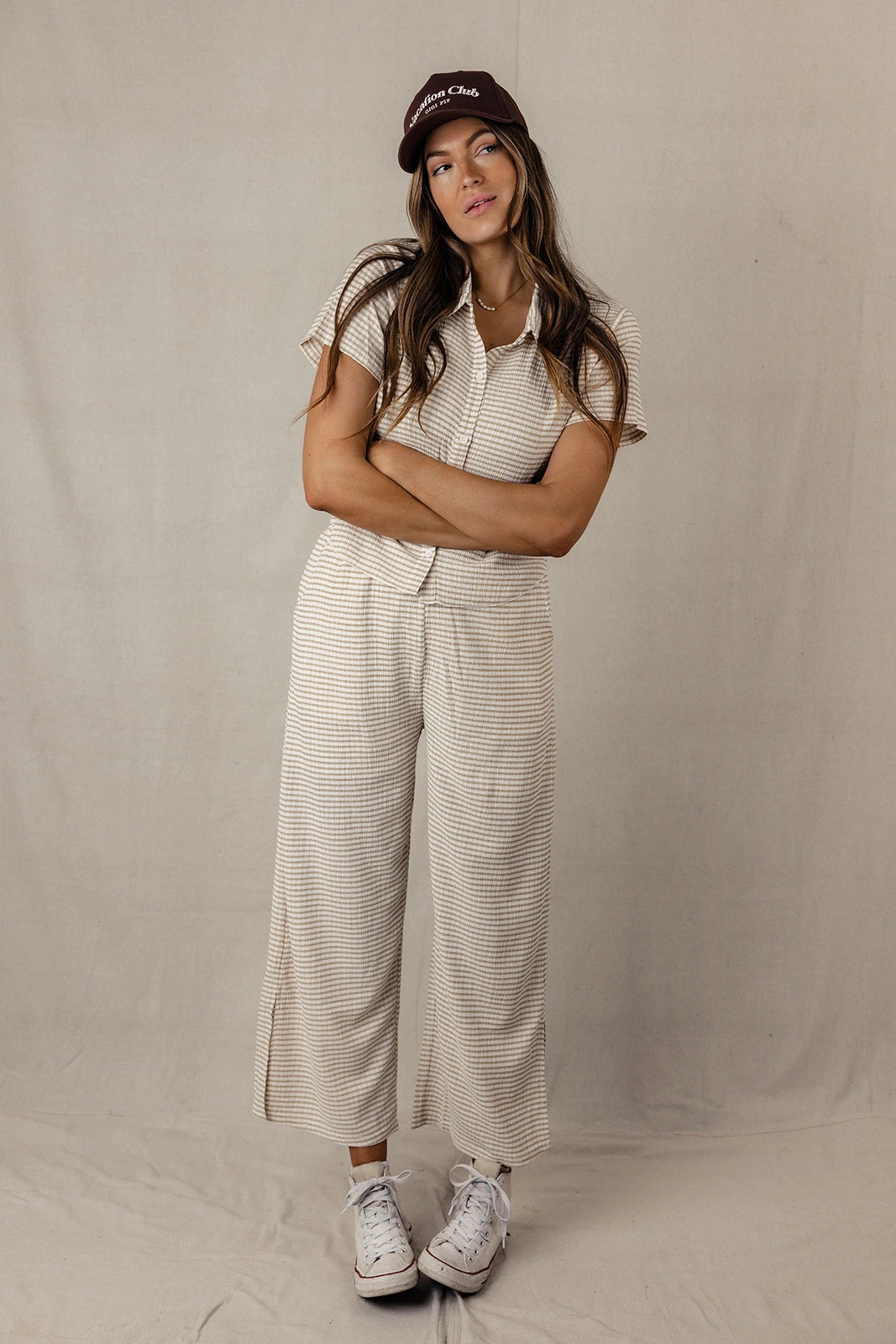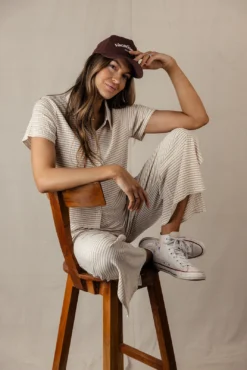 // paired with the kyla striped top + vacation club canvas trucker hat in saddlebrown