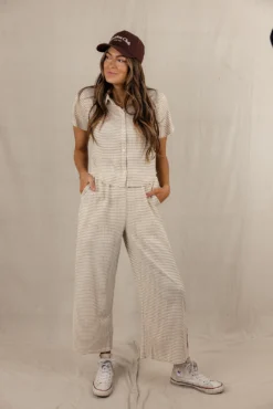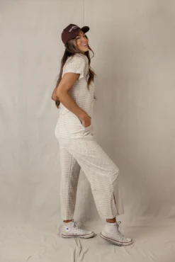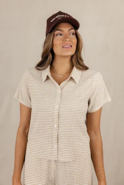 // paired with the kyla striped pants + vacation club canvas trucker hat in saddlebrown