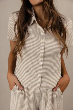 Wear this top with the matching pants for the perfect set! This top features functional buttons, a classic collar, and a slightly cropped fit. The Kyla is a simple yet trendy top that is ready for all seasons!