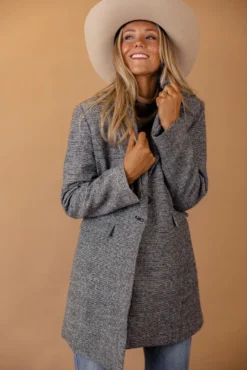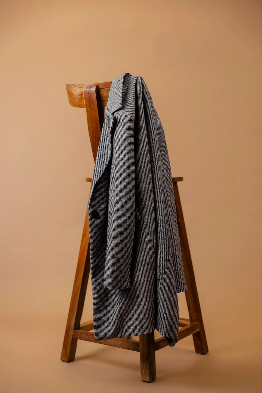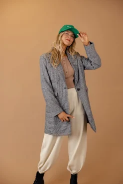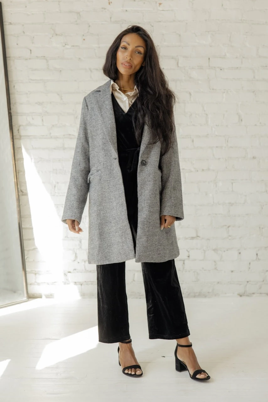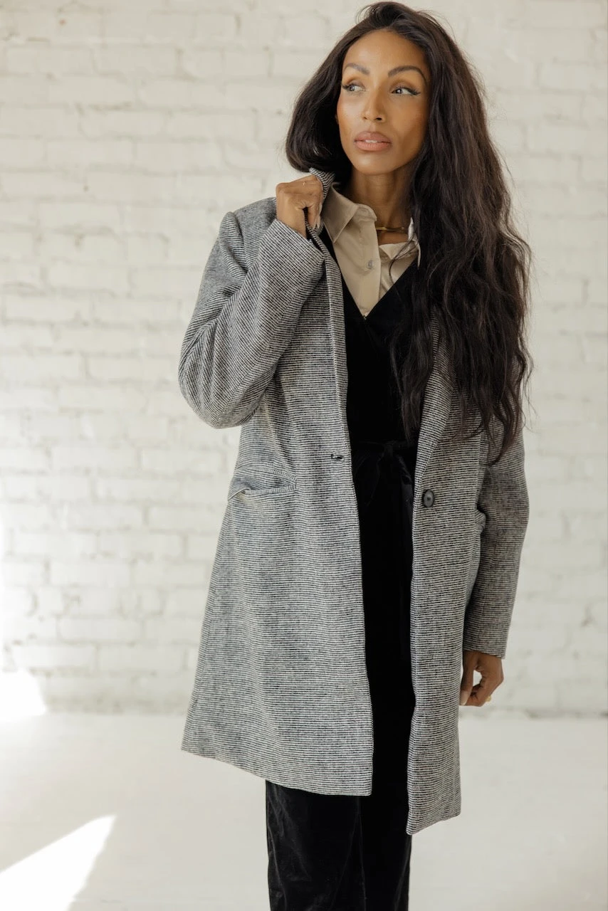 A simple pinstripe coat is what we all need right? This lovely coat features black and white micro stripes, a single button closure, and flap pockets. You can easily wear this over any outfit you choose and stay comfy and cozy.
