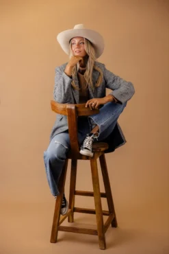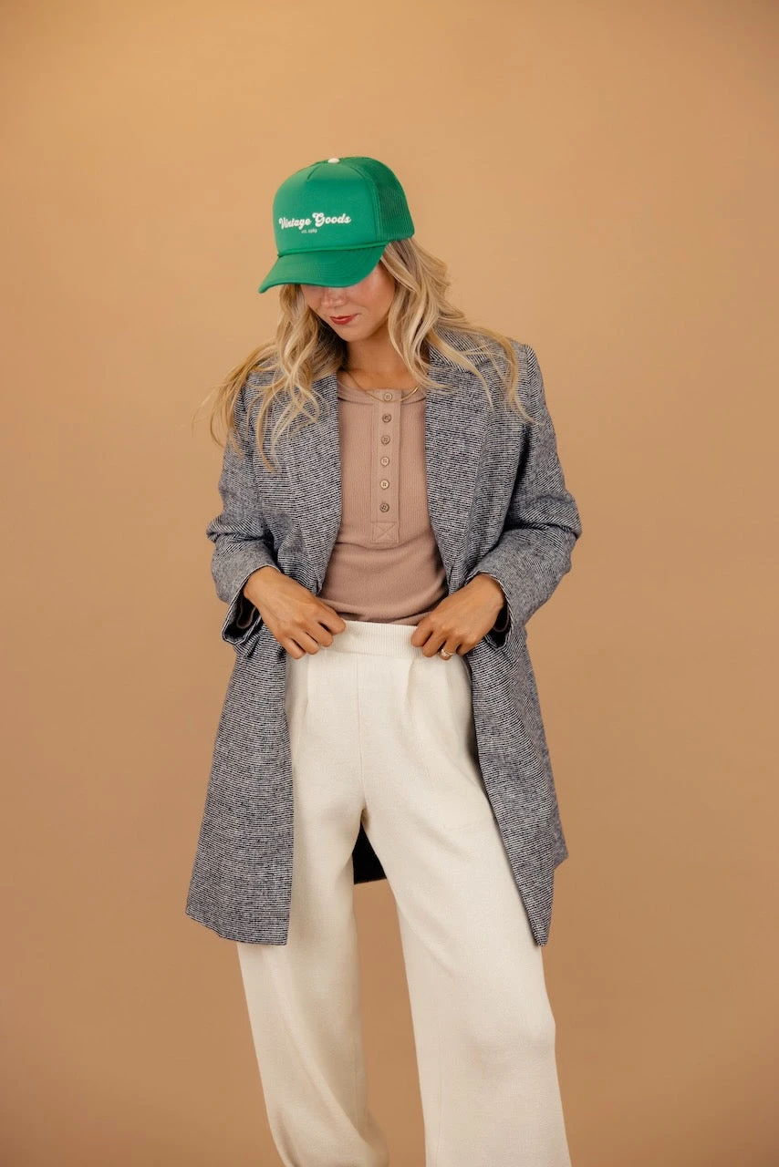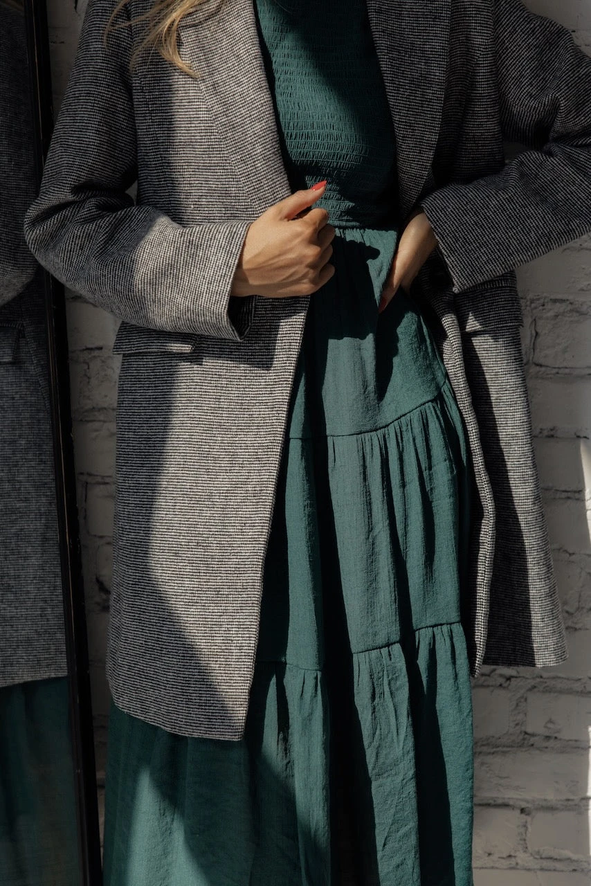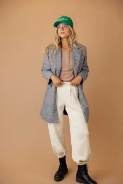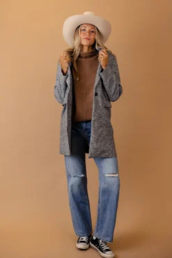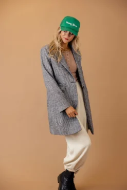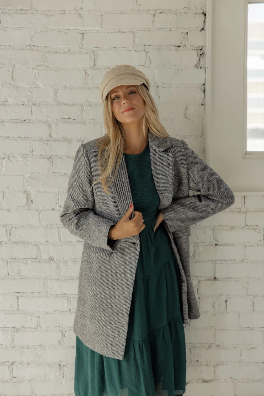 A simple pinstripe coat is what we all need right? This lovely coat features black and white micro stripes, a single button closure, and flap pockets. You can easily wear this over any outfit you choose and stay comfy and cozy.