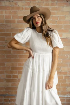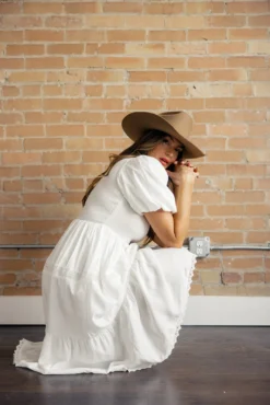 This elegant puff-sleeve dress is the ultimate stunner for your hot date on Valentine’s Day. It features a shirred bodice + lace detailing, making it one you will reach for again and again.