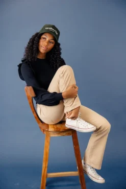 black // paired with the vacation club canvas trucker hat in darkgreen + hyrum high rise flare leg pants in cornsilk