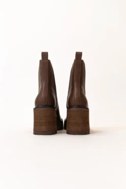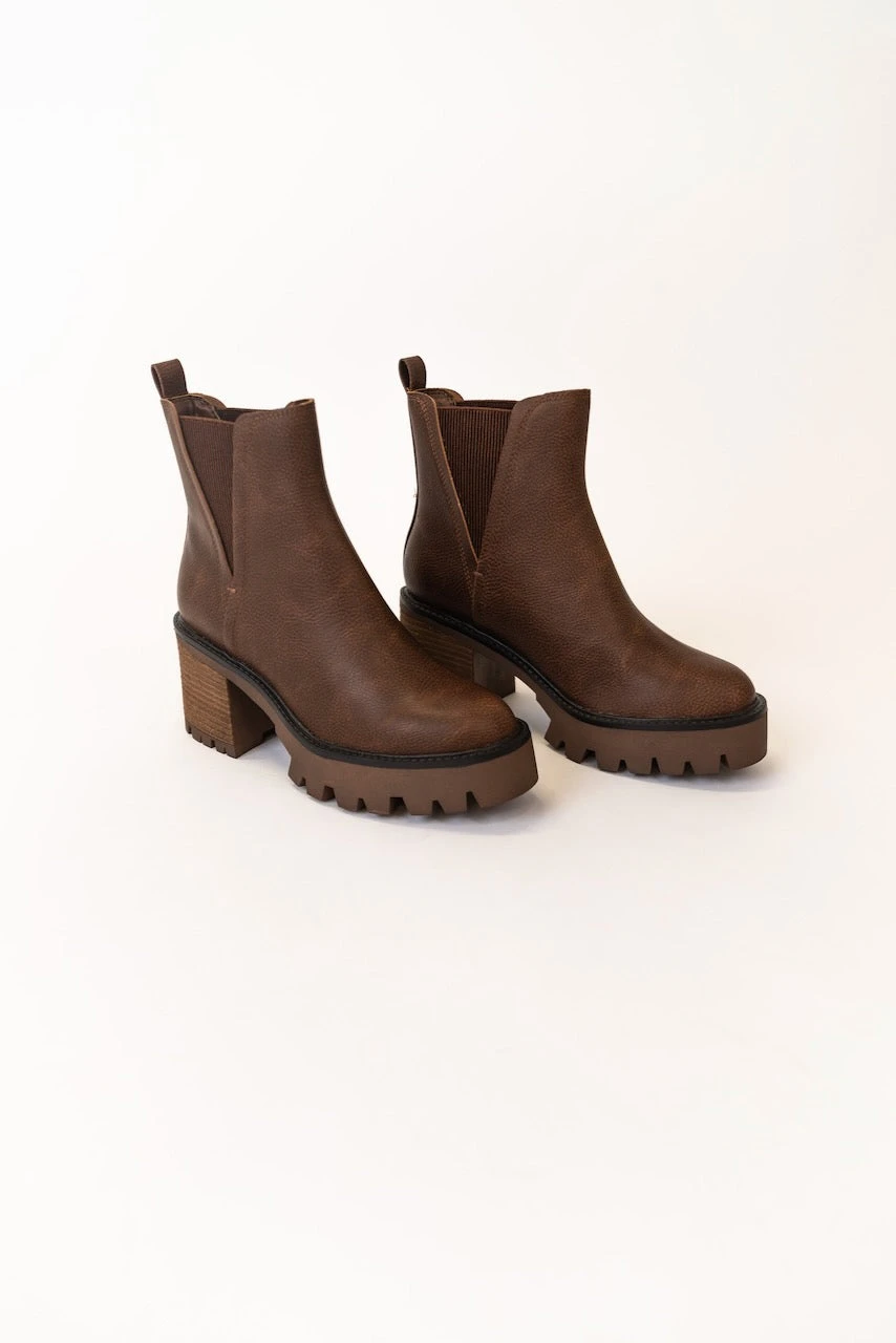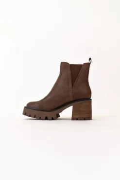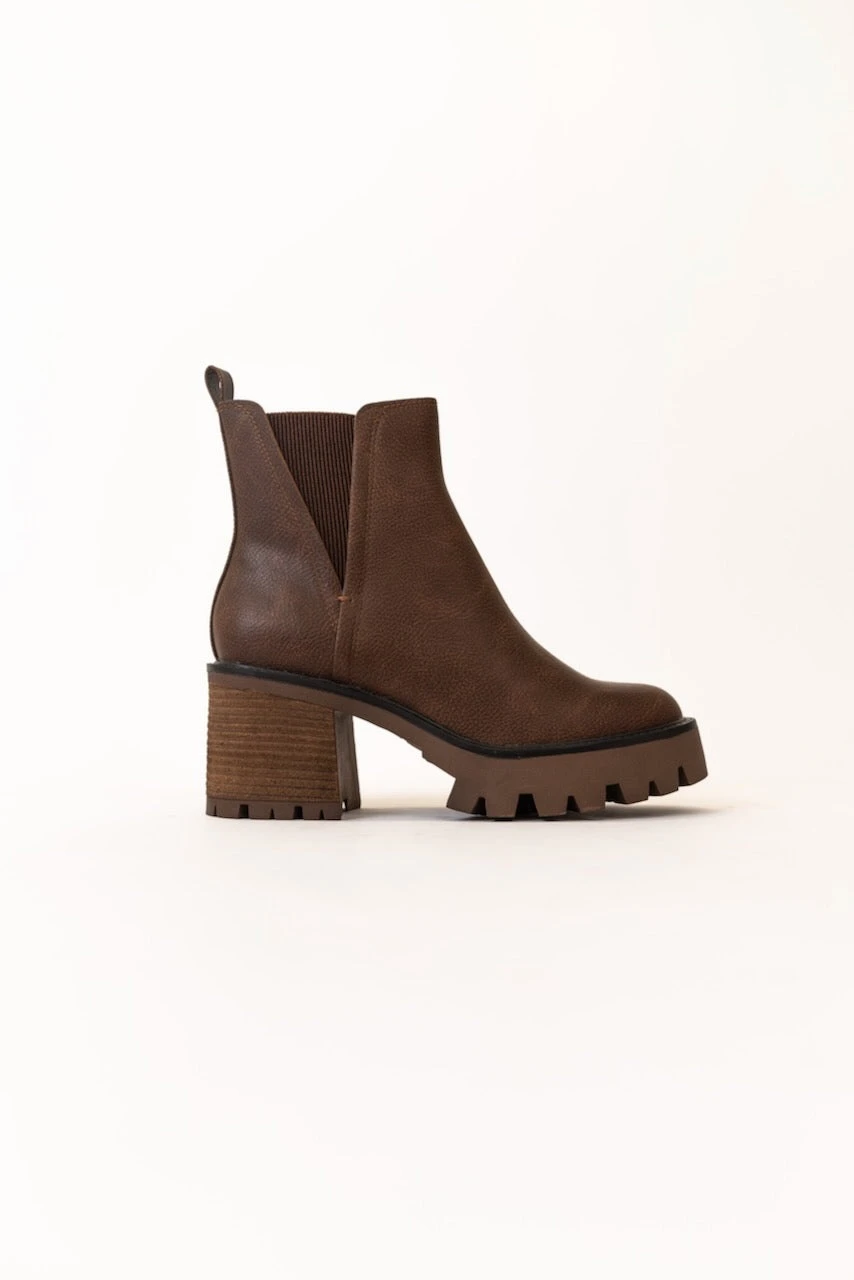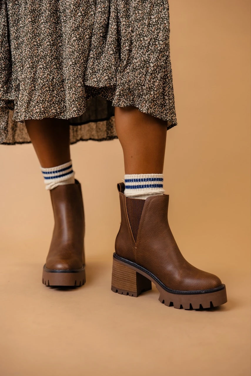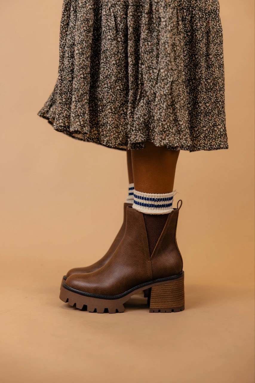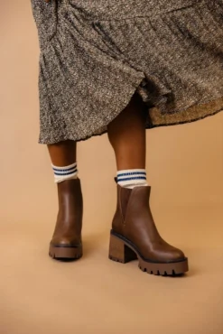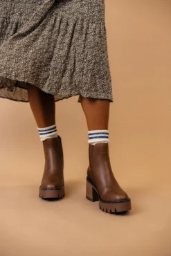 The Rusty is a dark brown bootie featuring a 3″ heel and a small platform. Take inspo from our pictures and pair with your favorite boot socks and a floral dress!