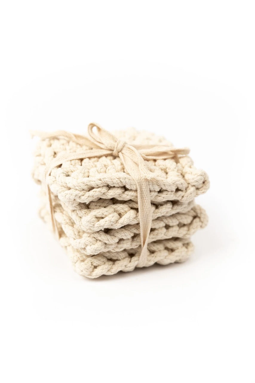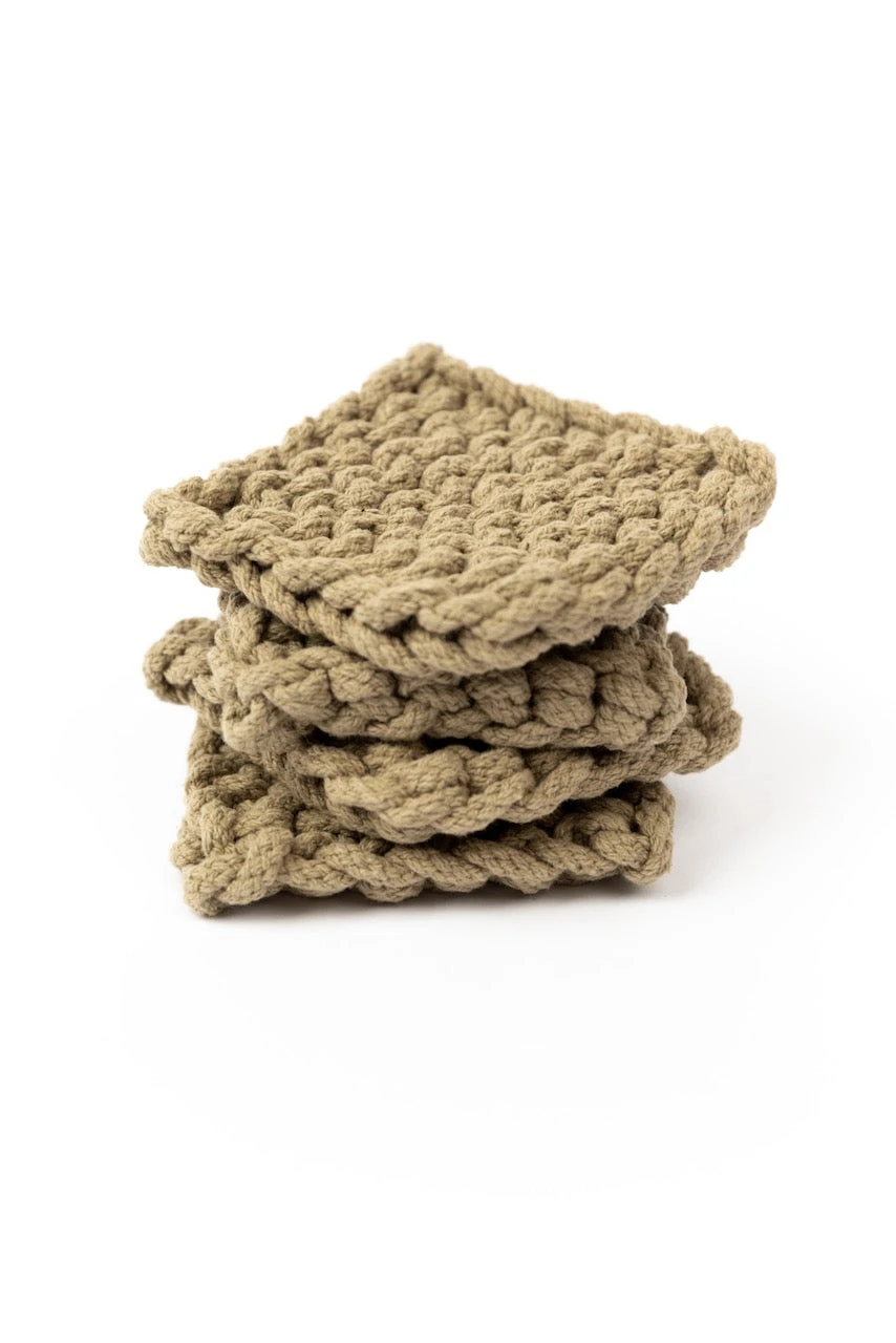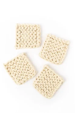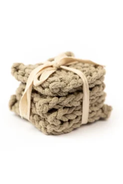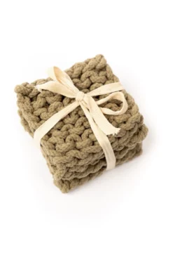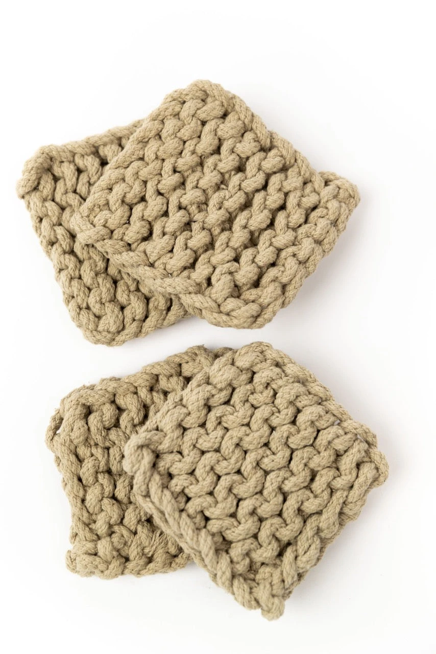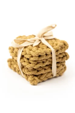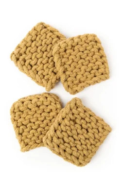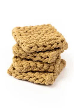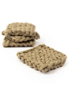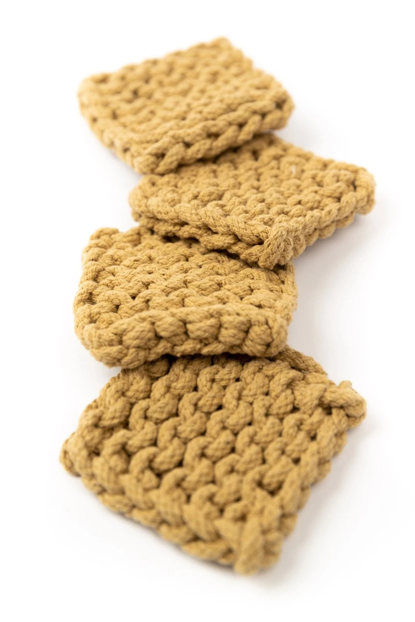 Add a little warmth to your home with these crocheted coasters. This set features four matching thick coasters that come in the perfect shades. These coasters add beauty + function to your farmhouse-style home. These crocheted square coasters will also protect your furniture while looking good!