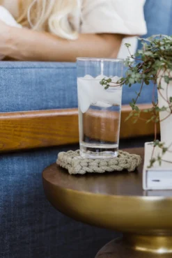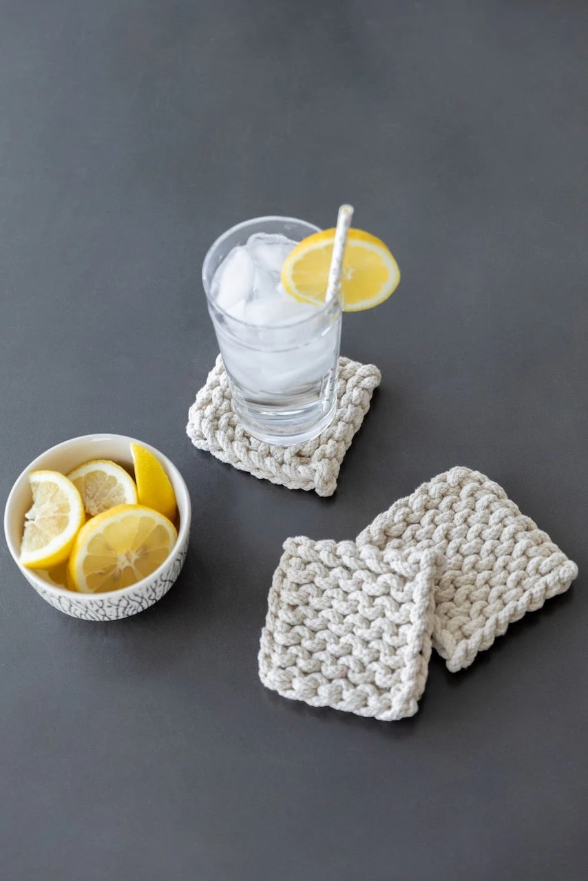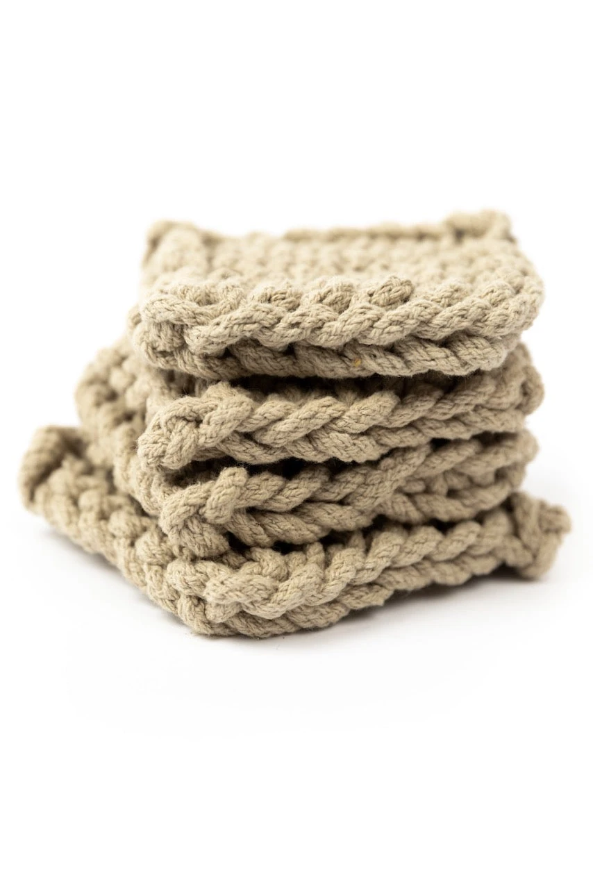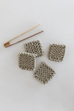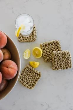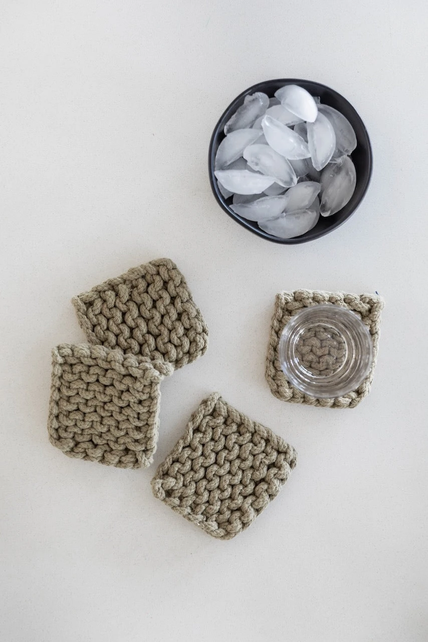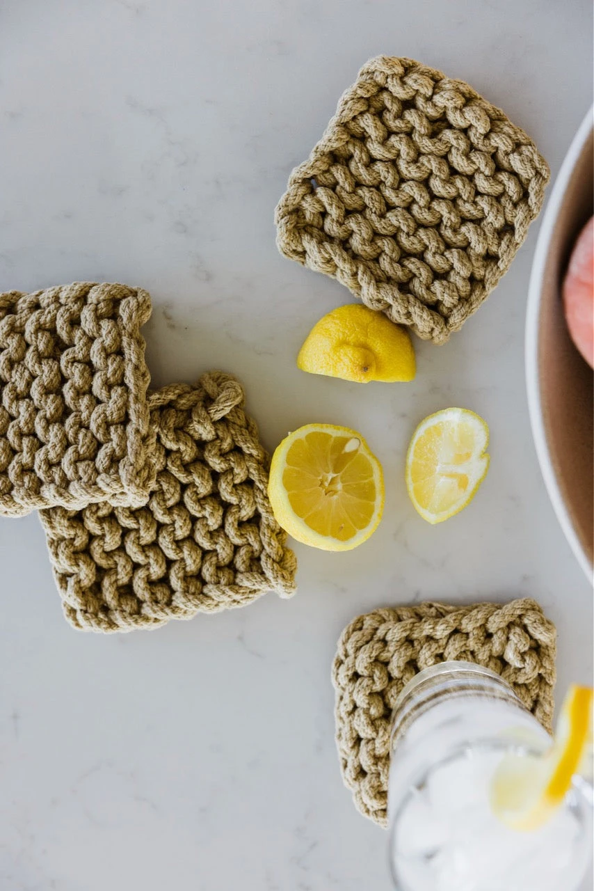 Add a little warmth to your home with these crocheted coasters. This set features four matching thick coasters that come in the perfect shades. These coasters add beauty + function to your farmhouse-style home. These crocheted square coasters will also protect your furniture while looking good!