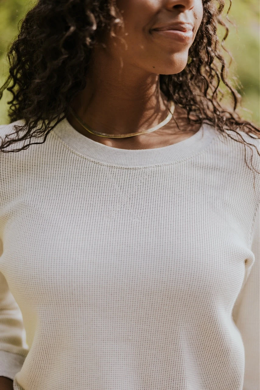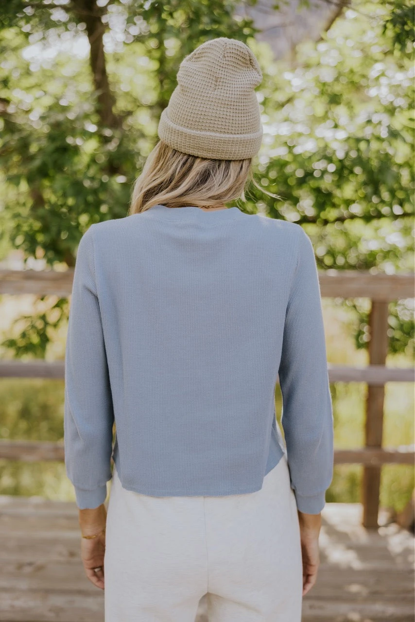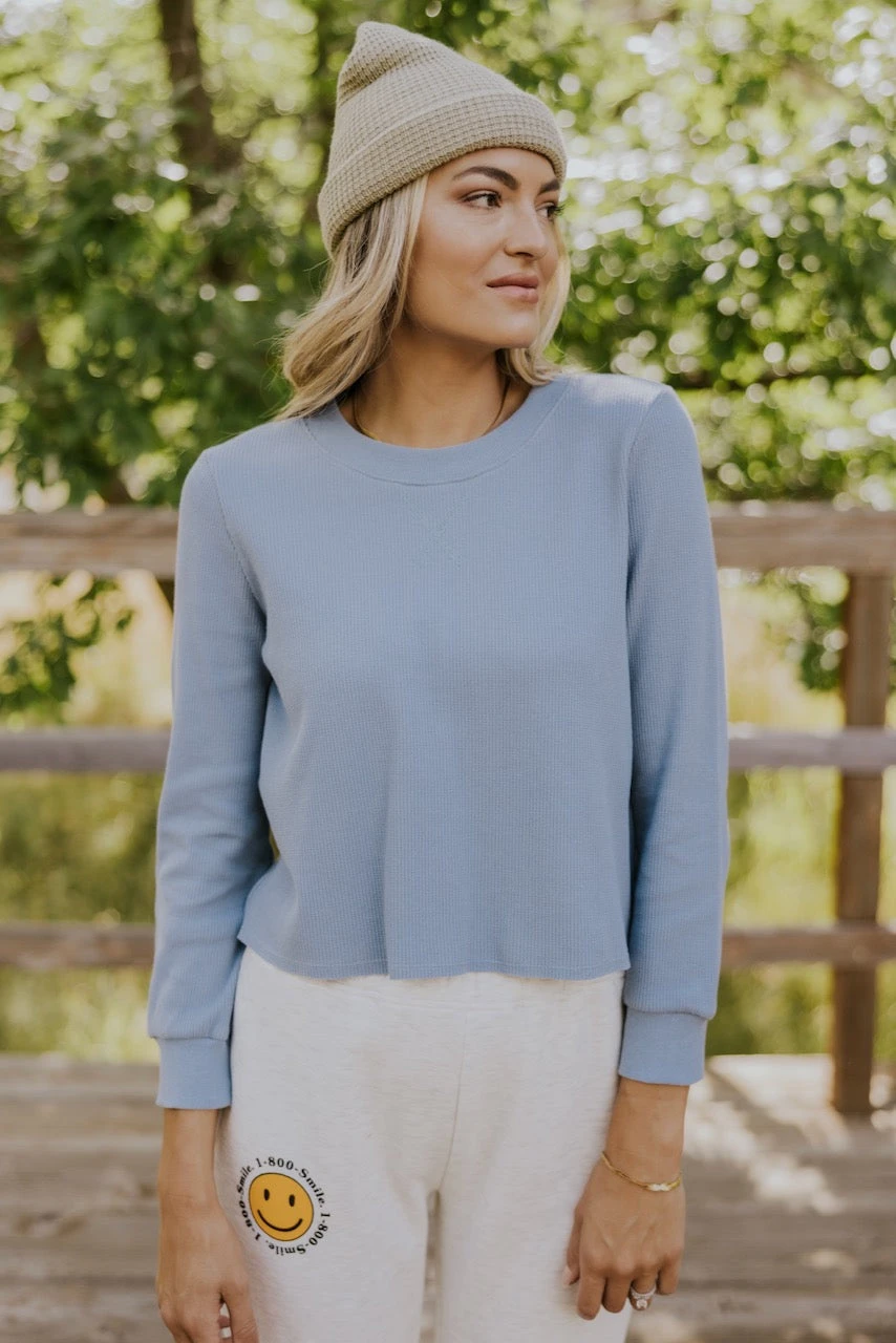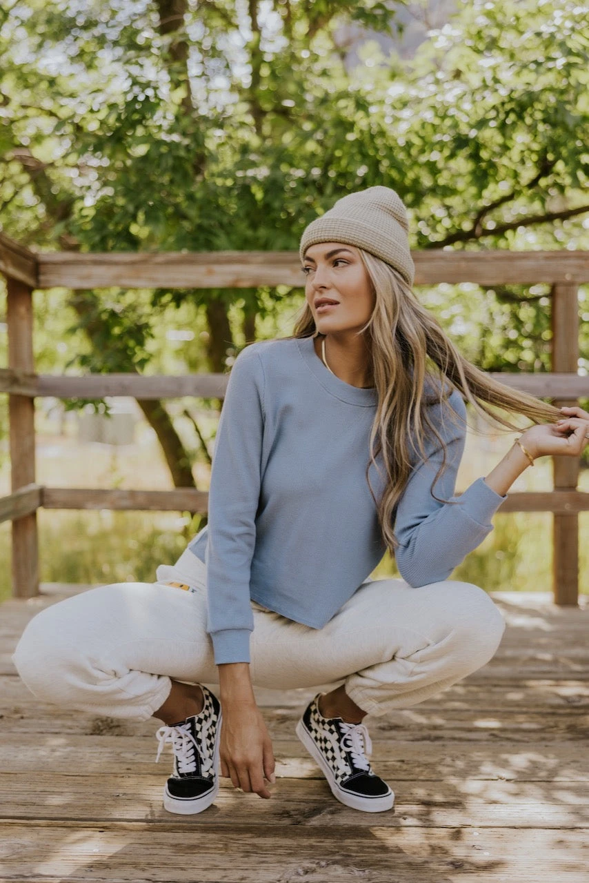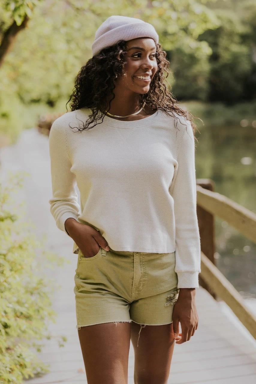 The perfect little waffle knit long-sleeve top that our Fall wardrobes are BEGGING for. Waffle knit. Long sleeve. Crew neck. Cropped length. Pairs so good with denim, comfy pants, and layered under jackets. She’s also perfect for your Fall adventures to the mountains or late nights by the water.