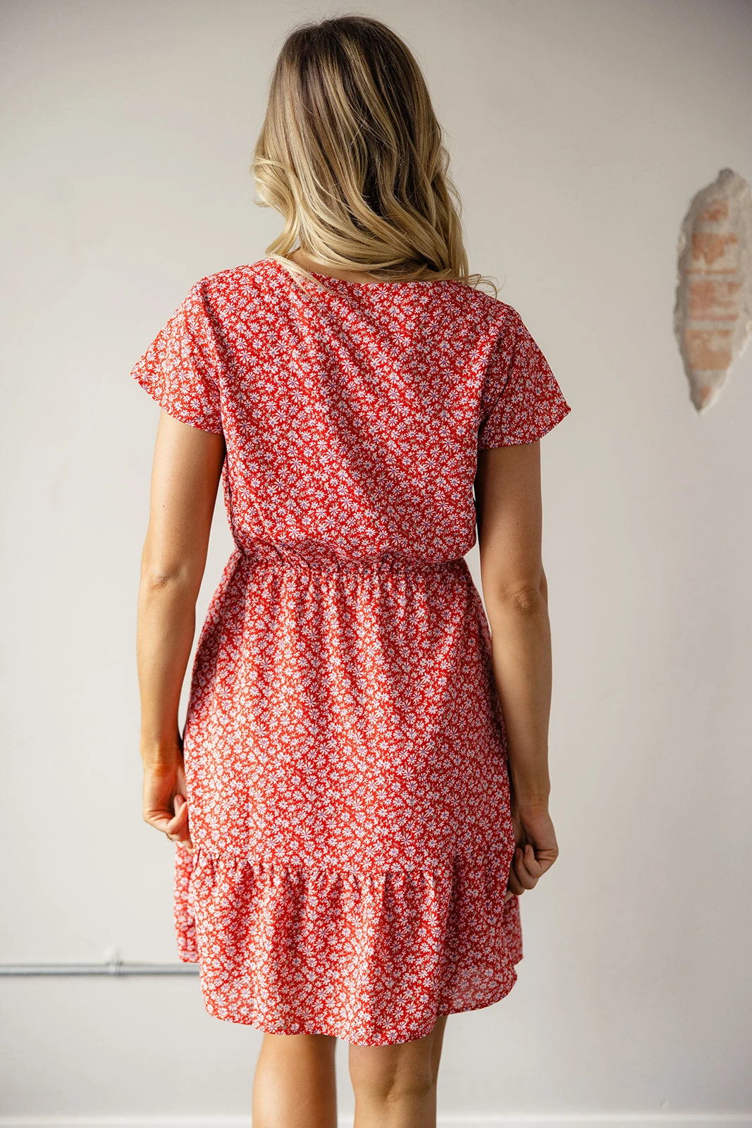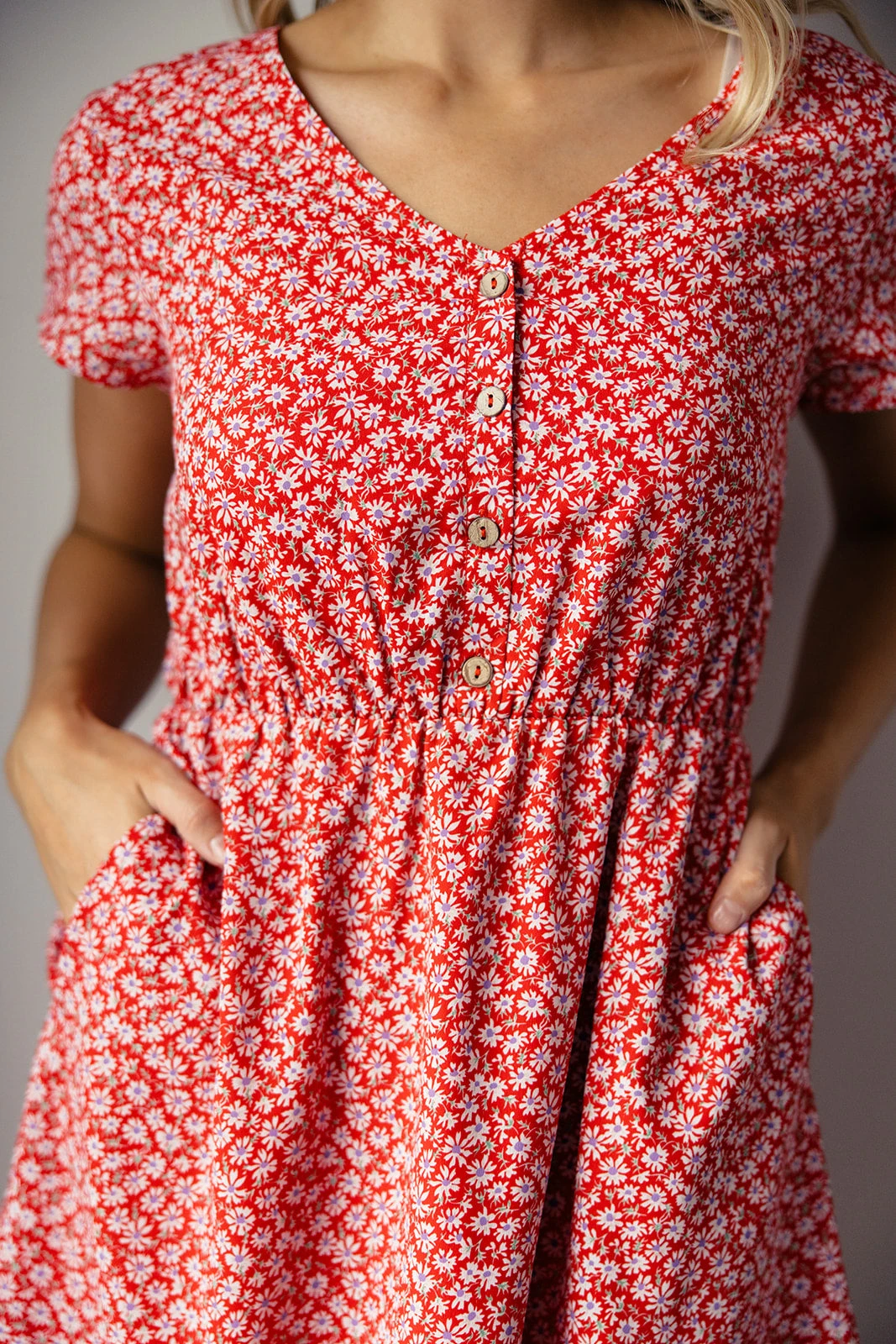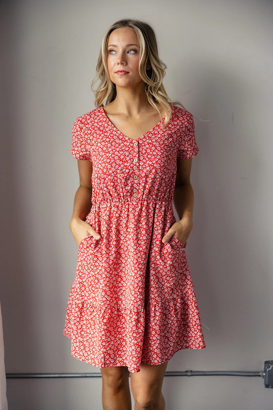 Step into enchantment with the Pixie Dust Floral Dress in a stunning shade of red. This short dress features a charming floral print and functional buttons for added style and convenience. The v-neckline adds an elegant touch, while the ruffle hem creates a whimsical and playful look. Pair with your favorite sneakers and cardigan or throw on a pair of heels and dance the night away!