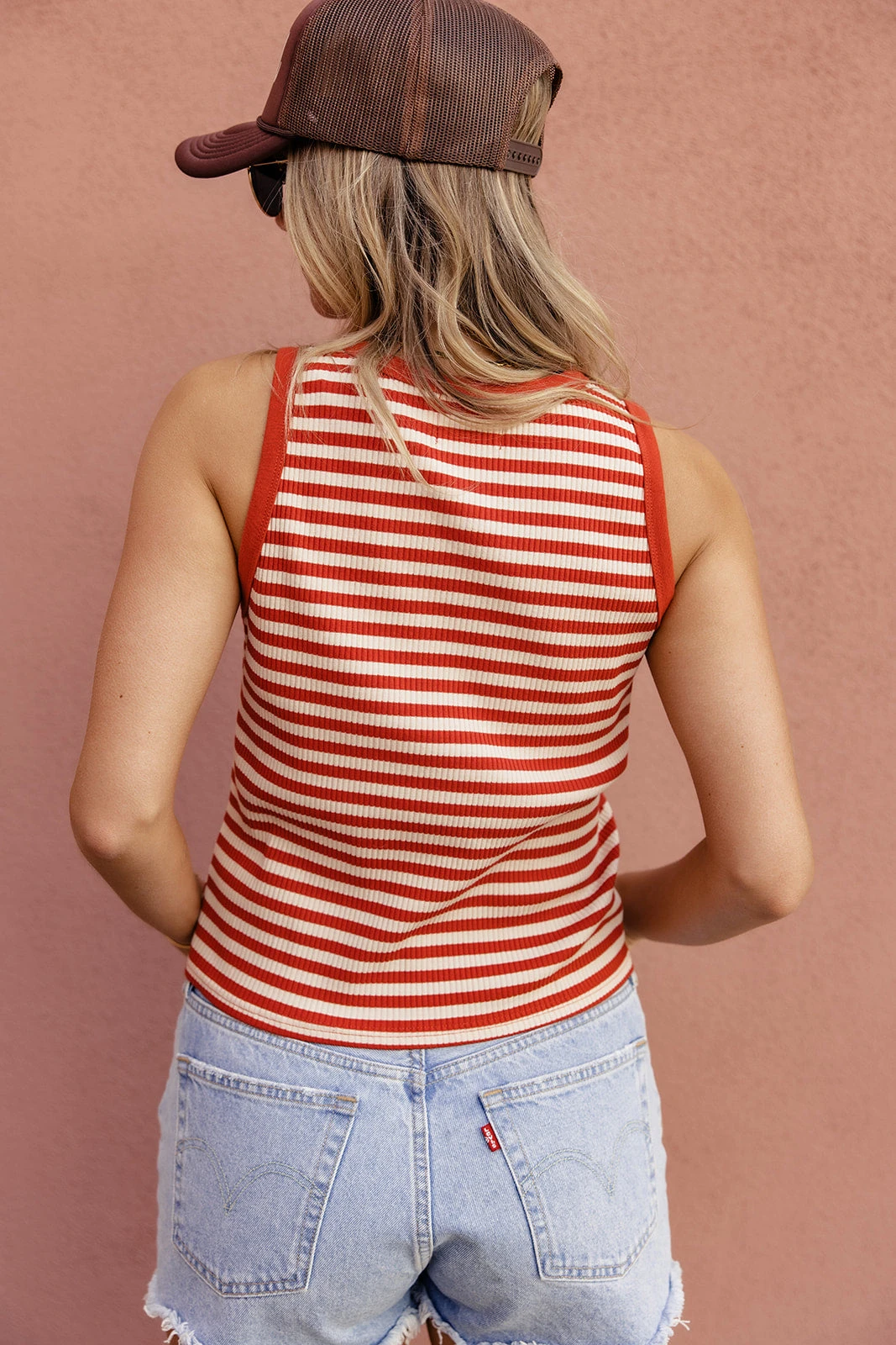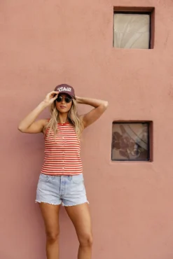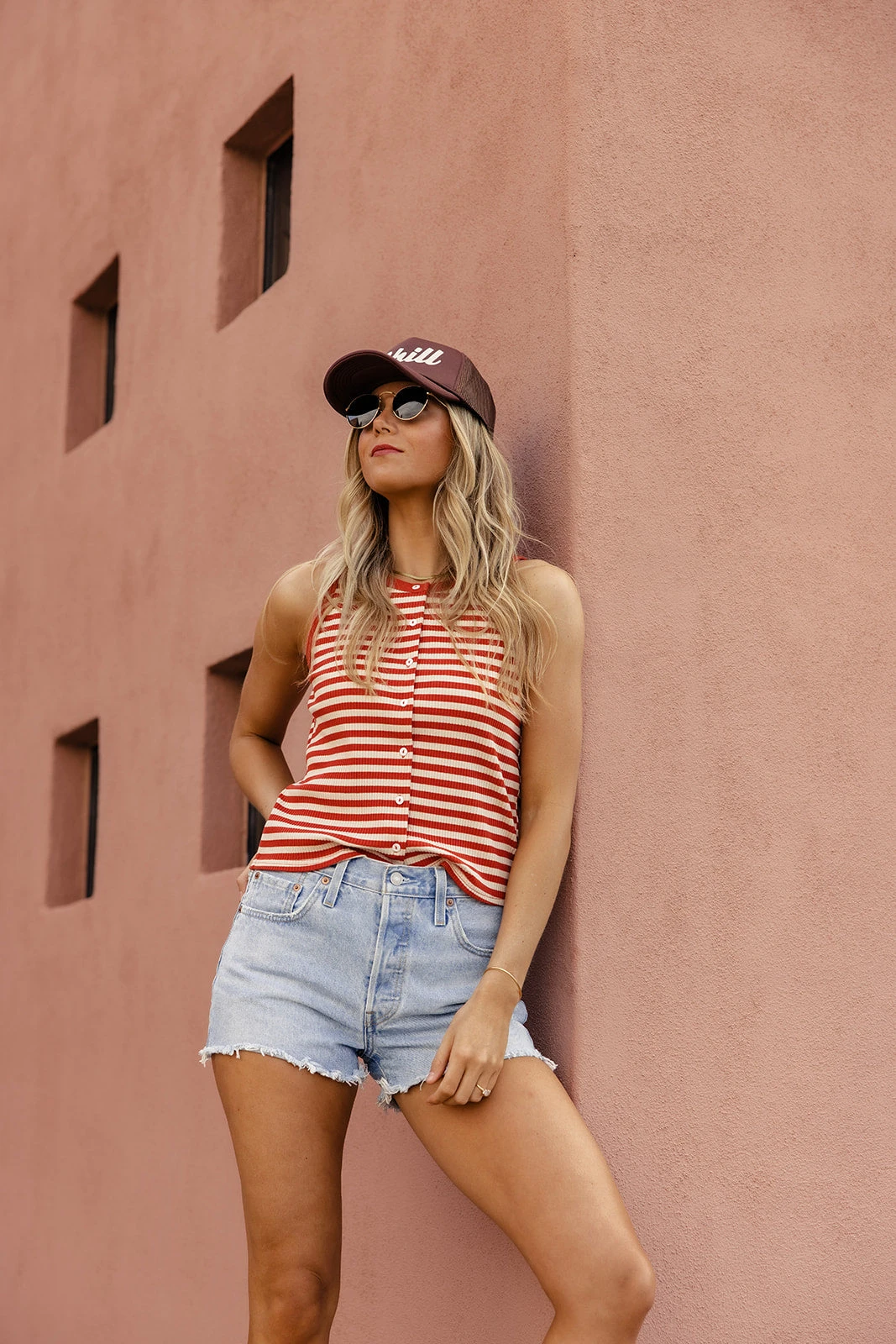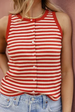 The stripes? Total head-turner. The ribbed texture? Hugs you like a BFF. And those buttons? Like a cute surprise party – unexpected, but oh-so-fun! Whether you’re brunching, beaching, or just bossing life, this tank is your go-to. Pair with your favorite shorts and some sandals and you’re ready to take on spring in style!