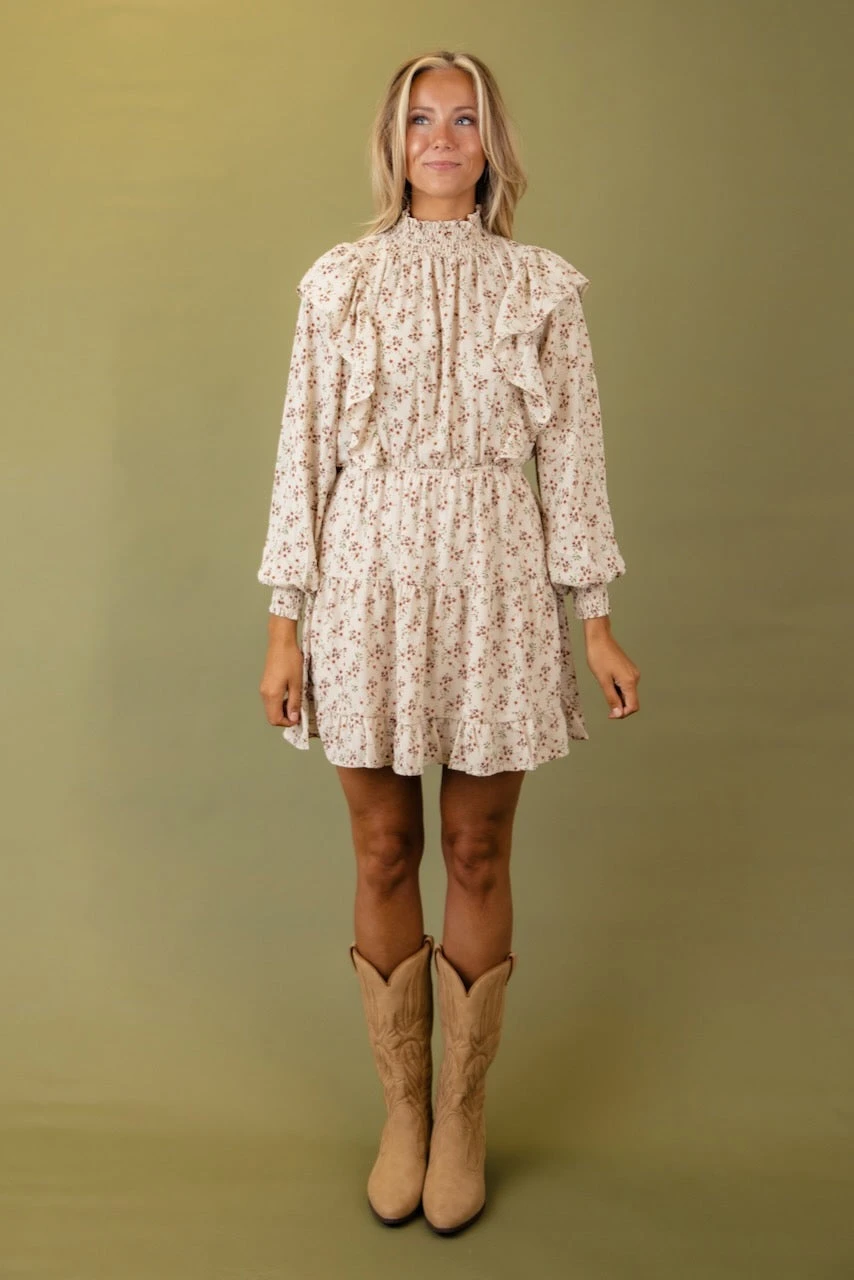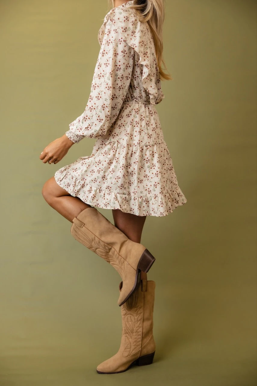 The Rosabelle Dress features ruffle details, poet sleeves, and a high neckline. It’s dainty and chic and looks good with tights and your favorite boots or throw on your cowboy boots and a blazer for a more trendy style.