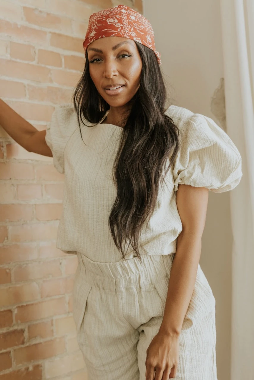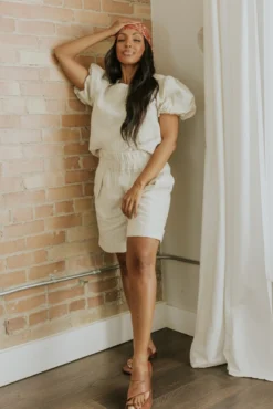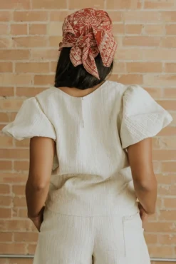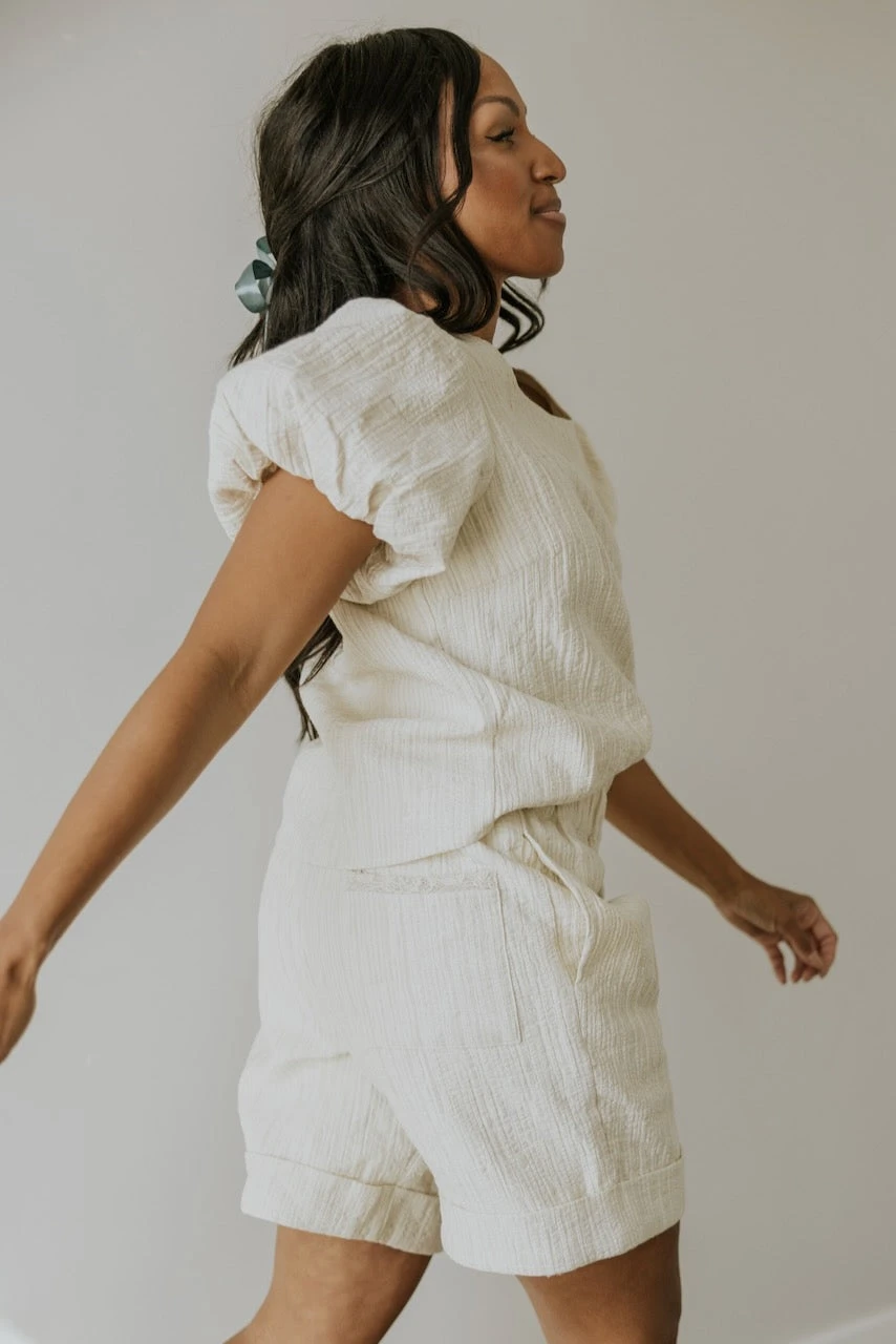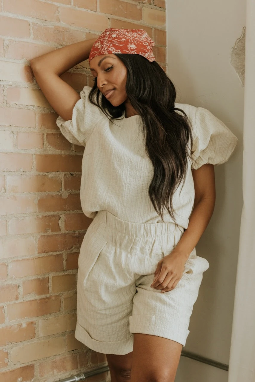 A blouse rich in texture and details can only be described as striking. Exaggerated puff sleeves, subtle square neck, and heavenly color. Simple enough for the office with tailored dress pants and glamorous enough for formal occasions with a black tulle skirt and heels. Pair her with the matching shorts and bring some of those details to the everyday. Spring and summer would be so honored.