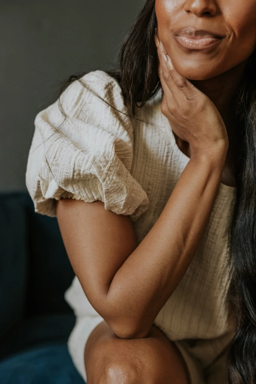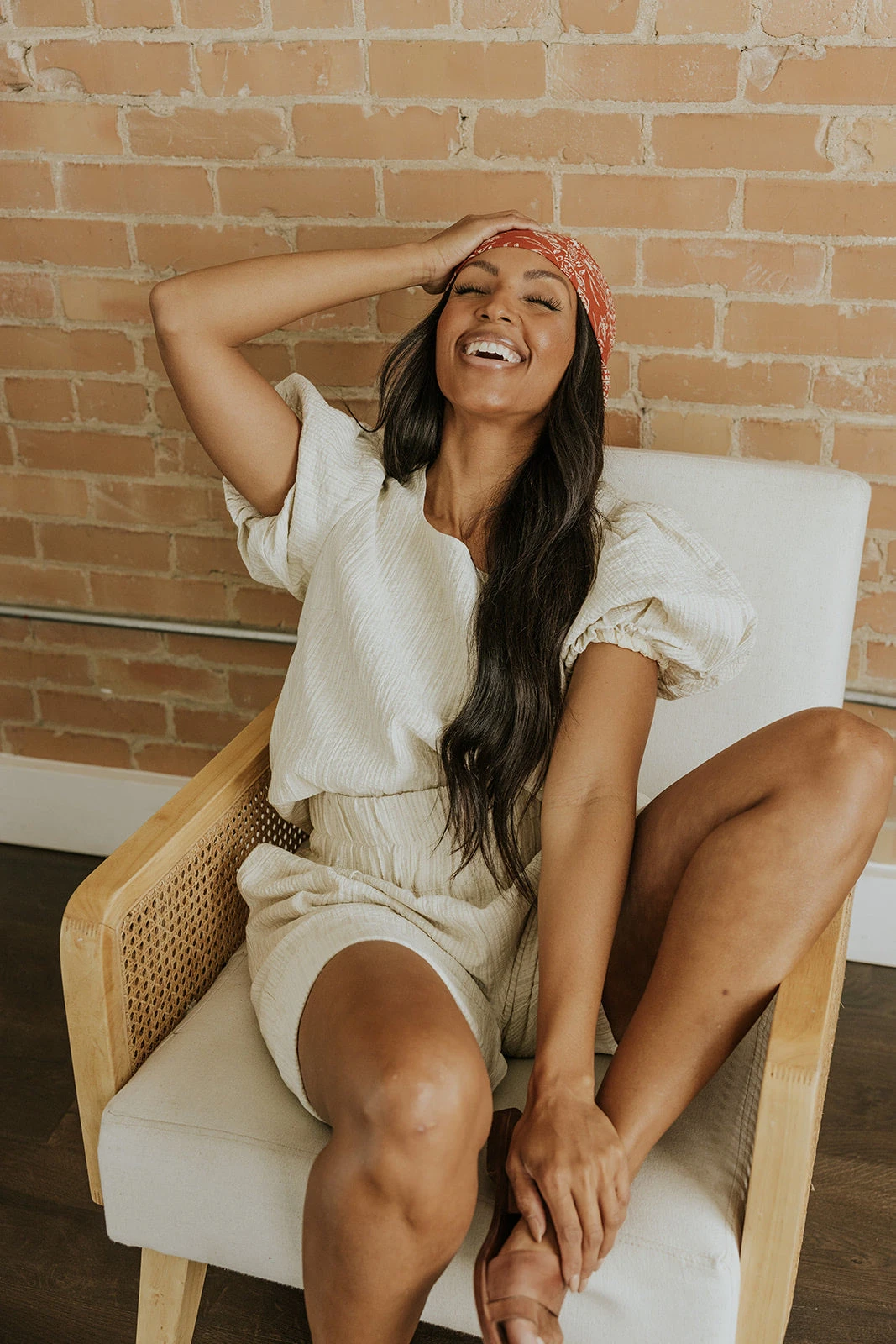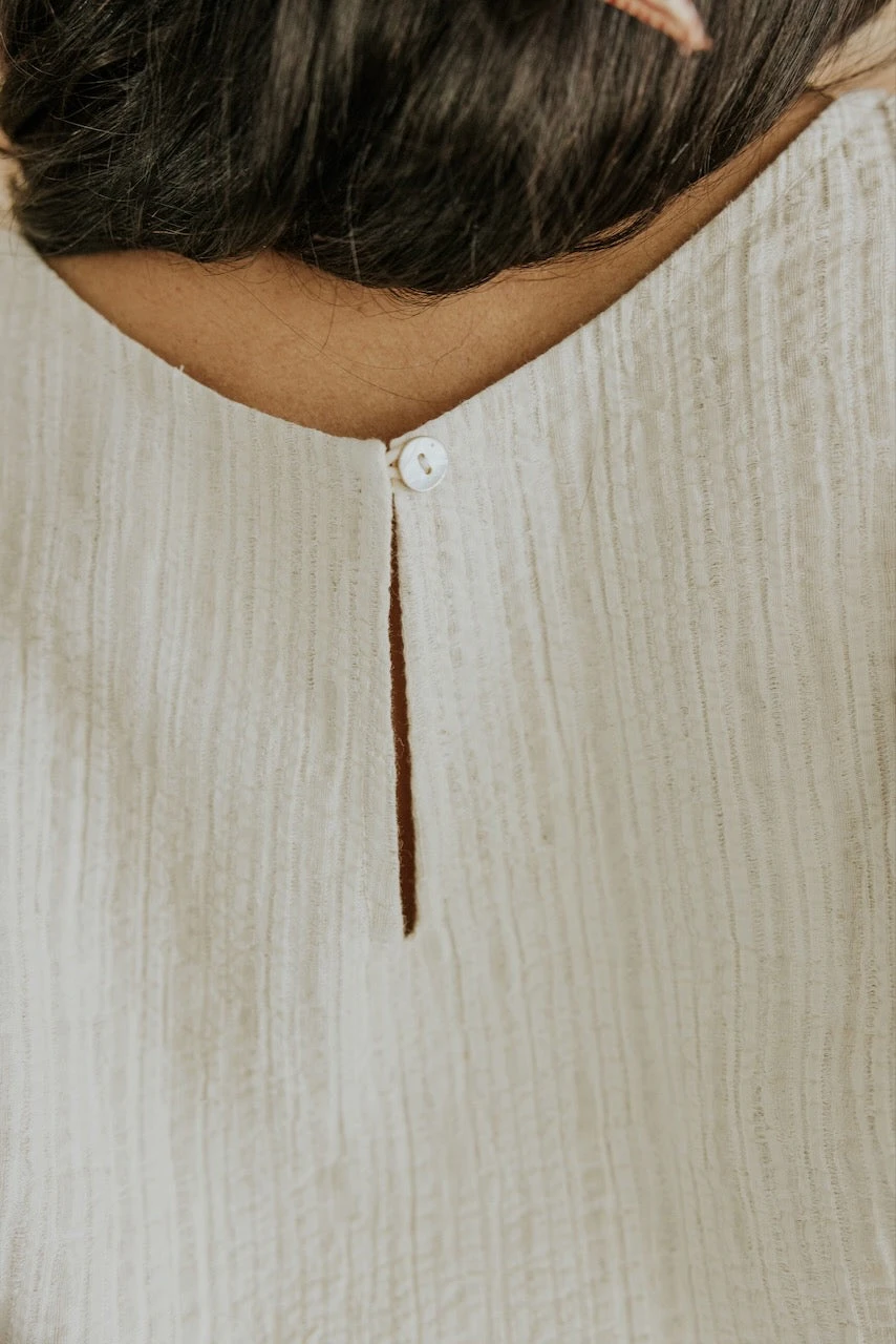 A blouse rich in texture and details can only be described as striking. Exaggerated puff sleeves, subtle square neck, and heavenly color. Simple enough for the office with tailored dress pants and glamorous enough for formal occasions with a black tulle skirt and heels. Pair her with the matching shorts and bring some of those details to the everyday. Spring and summer would be so honored.