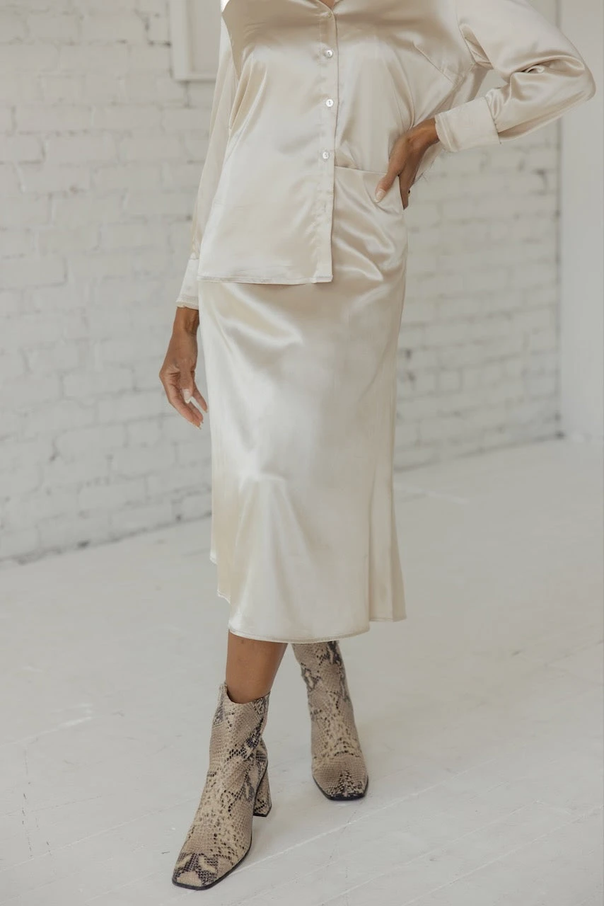This skirt is made from strength and stardust. Drape this flattering and classic slip skirt on and you’ll be ready for anything. Featuring an elastic waist, side zipper, and silky material. Pair her with your sweaters or the matching top to complete your look. This skirt will shine so bright that you can give your crown the day off.