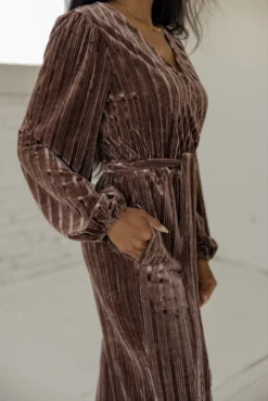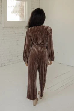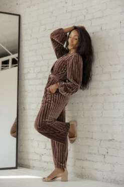 Sleek and high in glamour is the Laurene jumpsuit. This jumpsuit takes a classic silhouette and adds a modern spin that will have you stepping into your power every time you put it on. Fall in love with the statement details including the velvet striping, wide-leg silhouette, and pockets. Style with your favorite heels to achieve a standout look sure to turn heads.