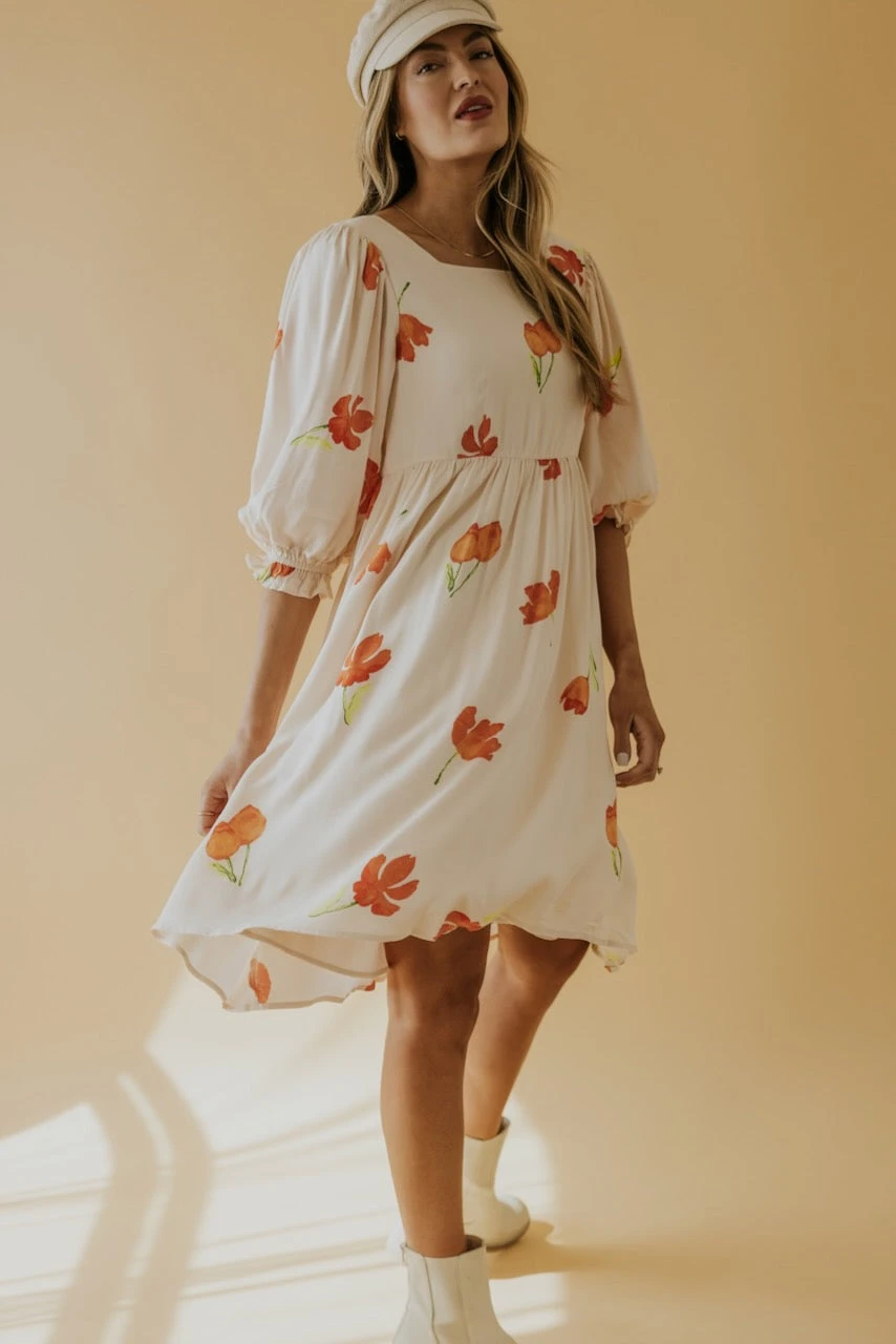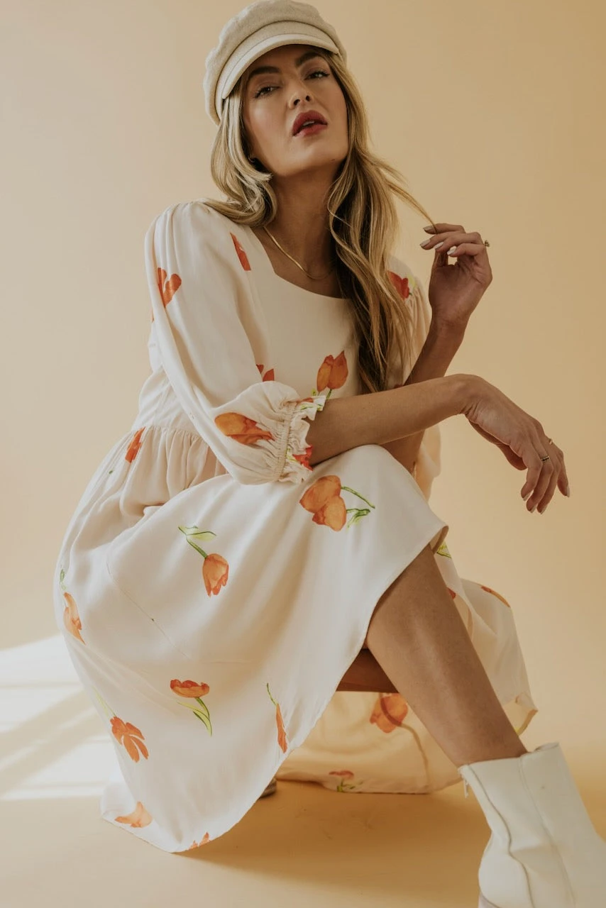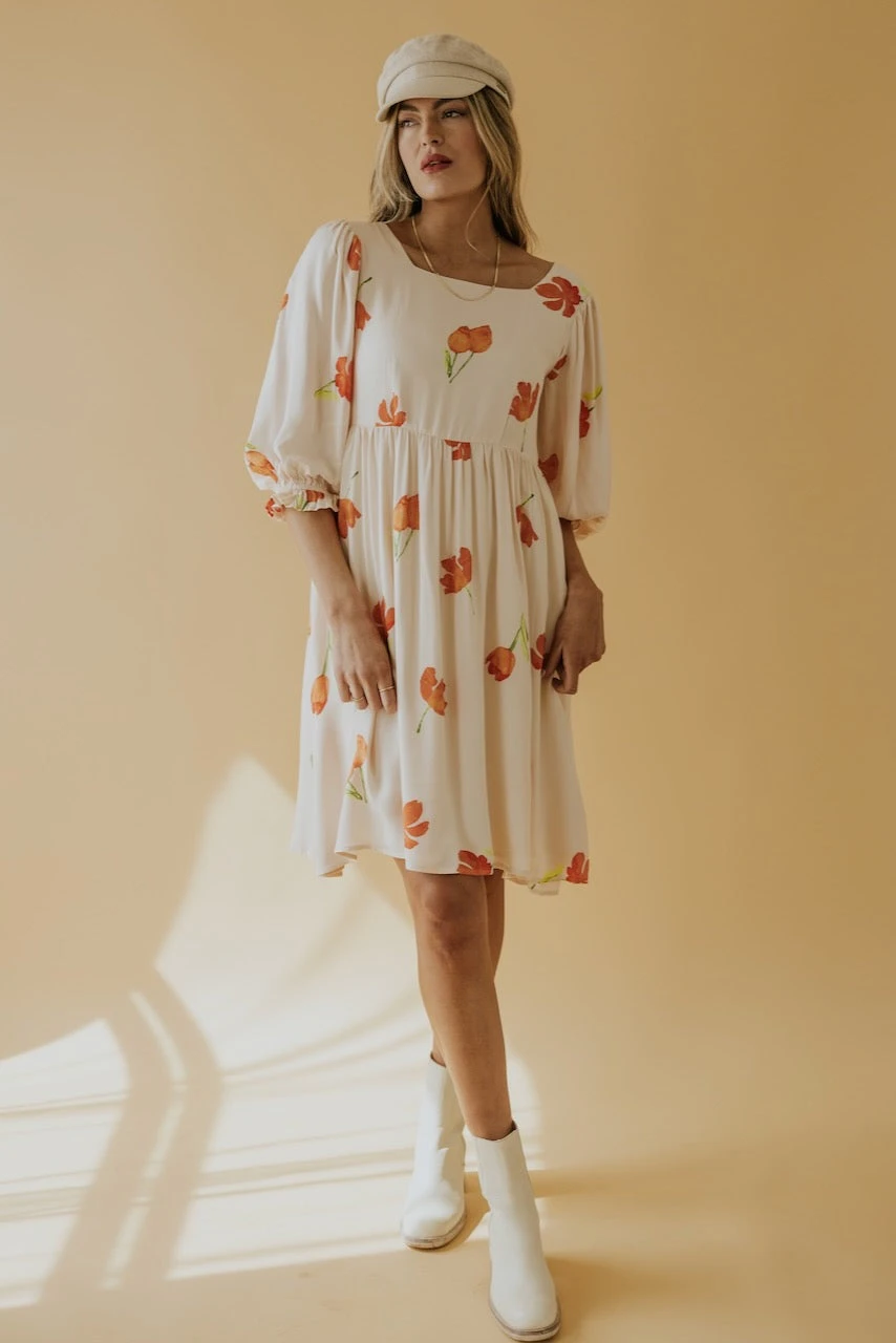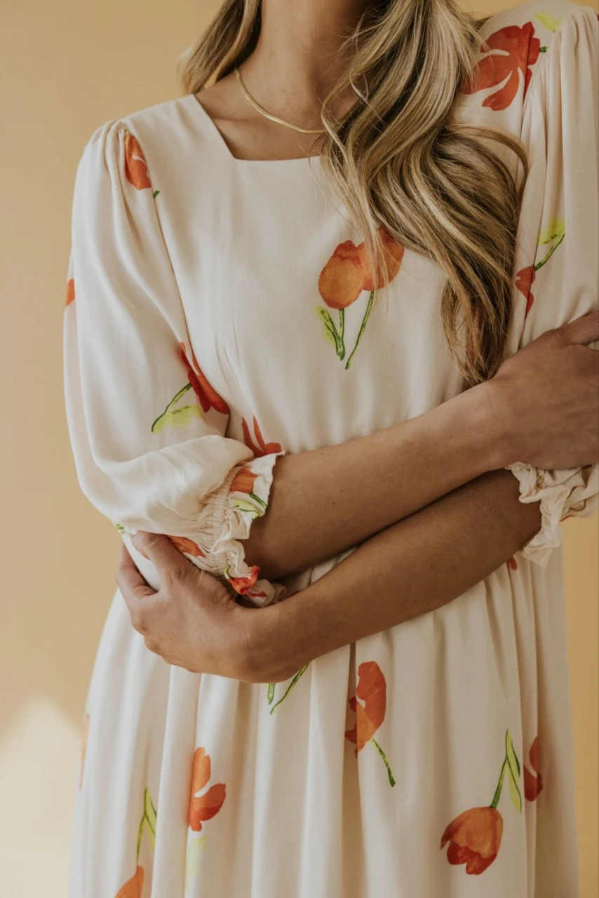 Square necked and joyously fabulous. Simple watercolor flowers in vibrant hues create a spring dress worth twirling about. A babydoll silhouette with poet sleeves, she has all the characteristics for a winning ensemble to any occasion. Family photos, spring weddings, and everything in between.