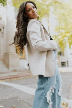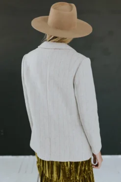 The late months don’t only bring us cold weather but a buffet of sartorial opportunities. This classic blazer is crafted in sumptuous wool and refined with a polished lapel, pinstripe detail, and a pop of color on the seam binding. This cream and rust stripe blazer offers a sophisticated or casual look depending on your choice of styling.