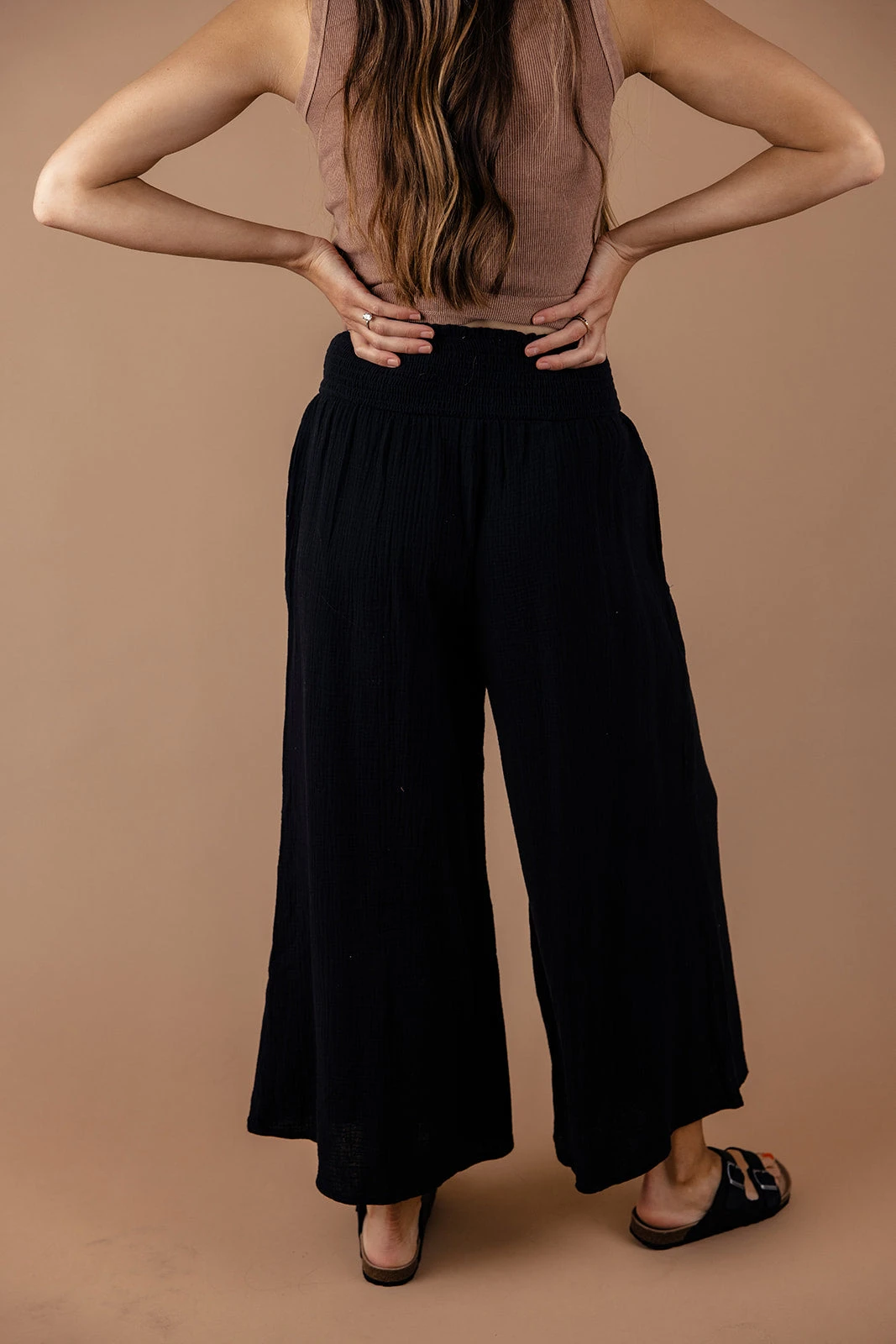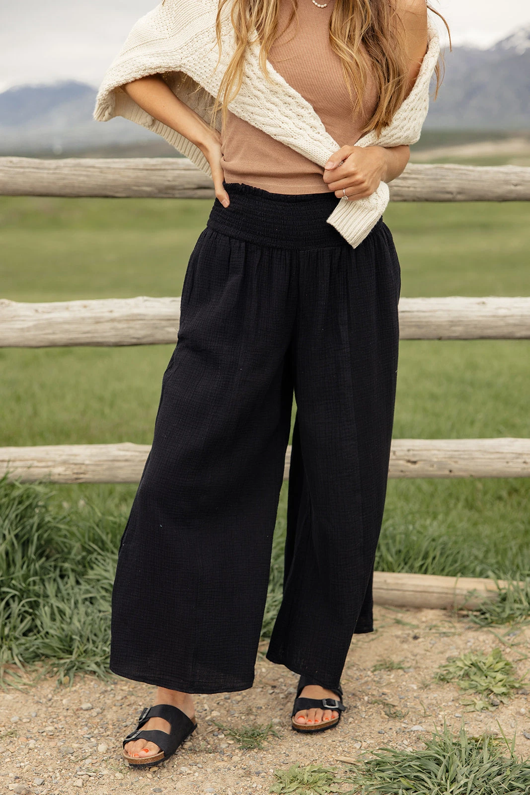 Someday Soon these fun wide leg pants will be your new favorite! Perfect for summer, they are 100% cotton and feature a wide smocked waistband plus pockets for all your goodies.