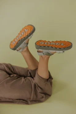 - UPPER: Full grain leather upper with puffed forefoot detailing. Two points of adjustability – midfoot webbing strap and heel leather ankle strap with hook and loop closures. Synthetic leather lining.