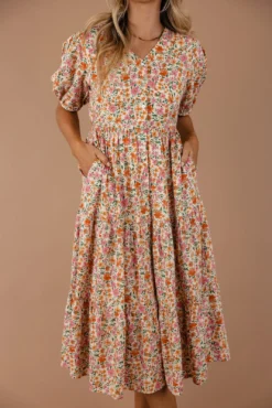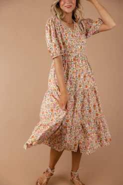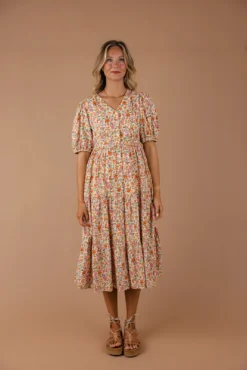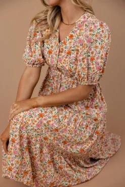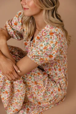The Sunday Kind of Love Dress features puff sleeves, a v-neckline, and functional buttons. We love it paired with a simple summer sandal but you can wear this dress from season to season. Floral dresses never go out of style 💛