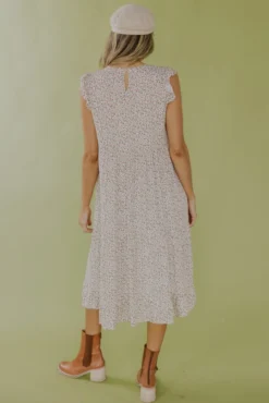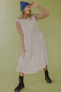 We’re channeling spring like a queen with this dress. Made for any time of the year, this dress features a ruffle cap sleeve, midi length, dainty floral pattern, + flirty silhouette. Style this dress with a cardigan or sweater over top and your favorite sneakers or pair with a bodysuit underneath and your favorite wide-brim hat. Any way you style this dress, you’ll surely look effortless.