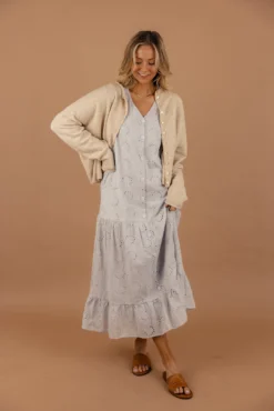 The Tamora Dress is here to make your heart skip a beat. With its charming tiered design, flattering v-neckline, and delightful full-length buttons, this dress is the epitome of easy-breezy elegance. Perfect for picnics, brunches, or strolls along the beach, it’s a must-have for your summer wardrobe.