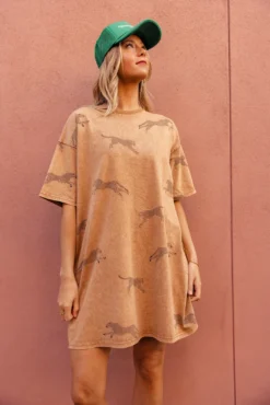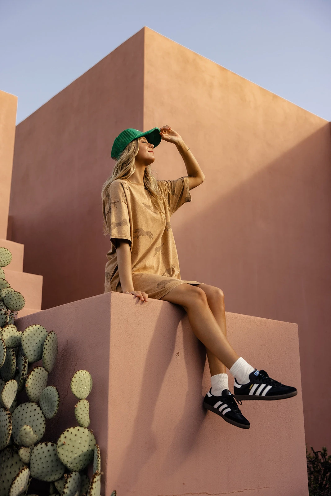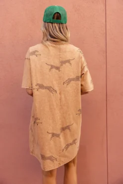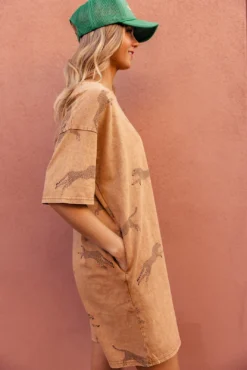 Unleash your inner wild with this playful dress featuring subtle cheetah prints on a bed of mineral-washed cotton. The relaxed silhouette and slight oversized fit make it an easy choice for a day out or a laid-back evening in.