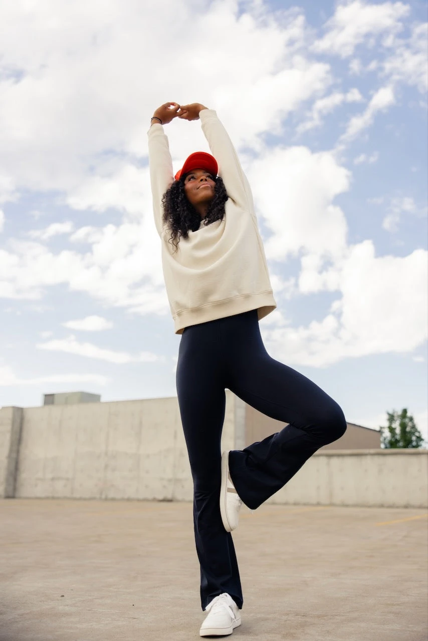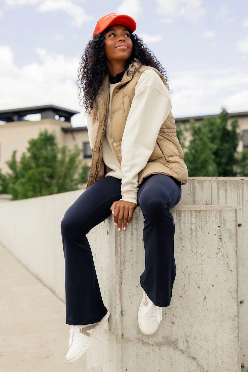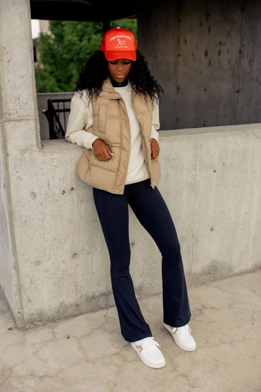 // paired with call it magic plaid shacket in steelblue, all fenix rise sports bra, never better sweatshirt in ivory, strangest feeling puffer vest, + mia krew casual sneakers in burlywood