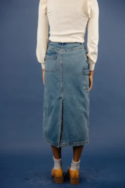 This long denim skirt brings us back to the 90’s – in a good way! Featuring cargo pockets at the hips and a slit in the back for easy movement, this skirt will pair with tees, sweaters, and your favorite jackets this winter!