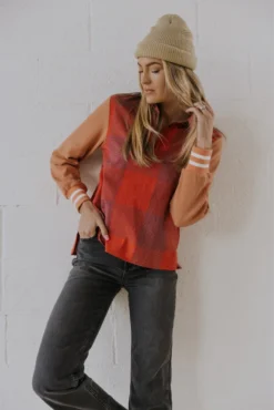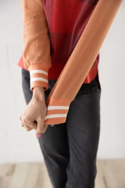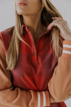 This year deserves happiness, fulfillment, + daring tops. Featuring a plaid body, waffle sleeves with striped cuffs, + working buttons. Pair her with black jeans and booties for a night out. Or with leggings, a puffer vest, + a beanie for a cozy day in.