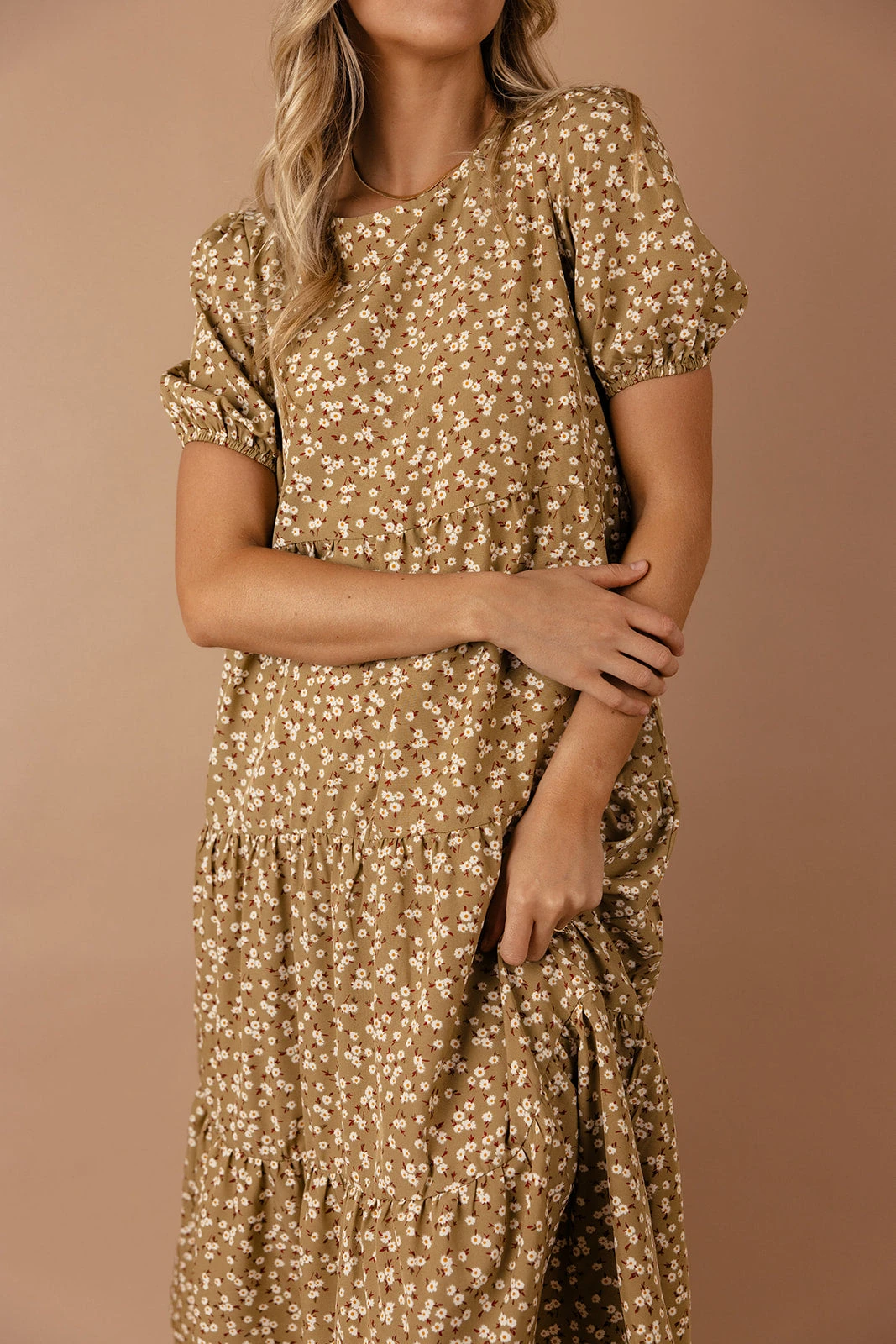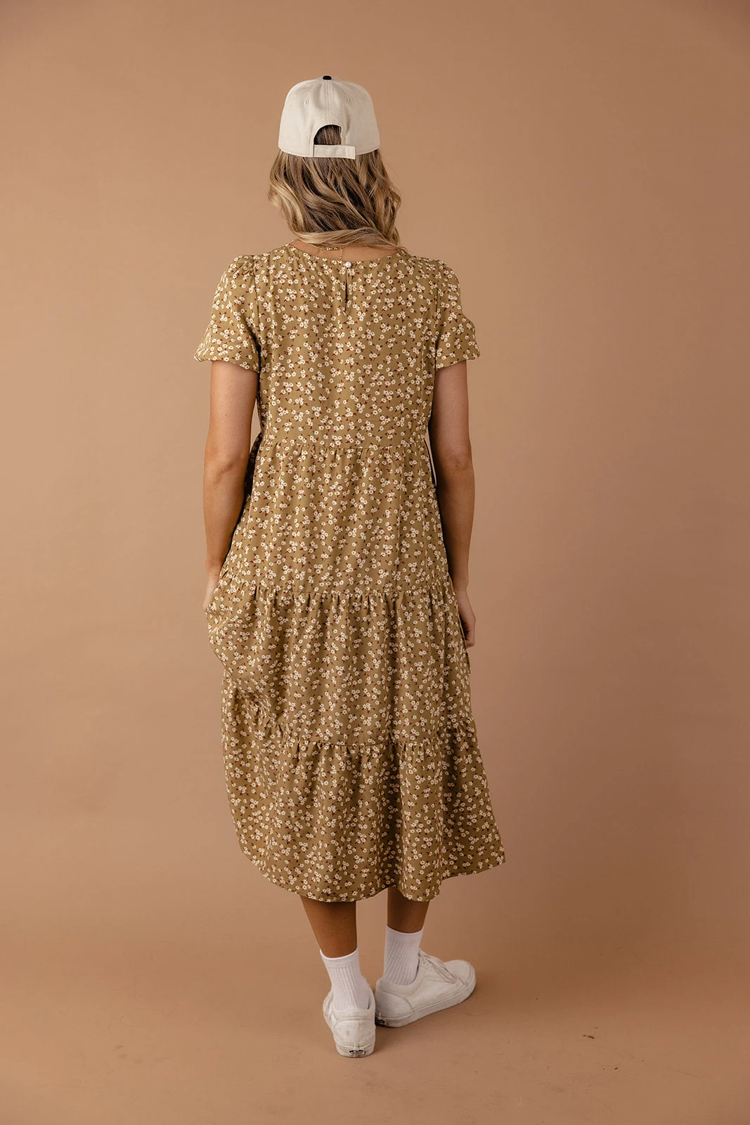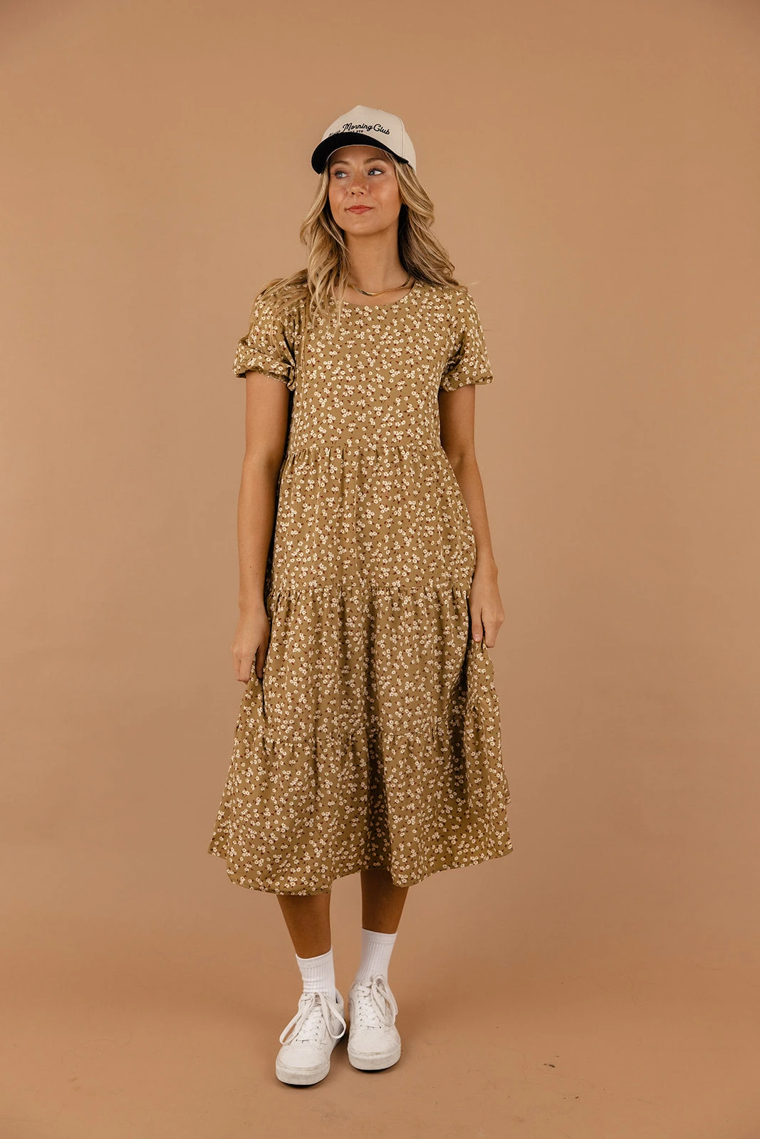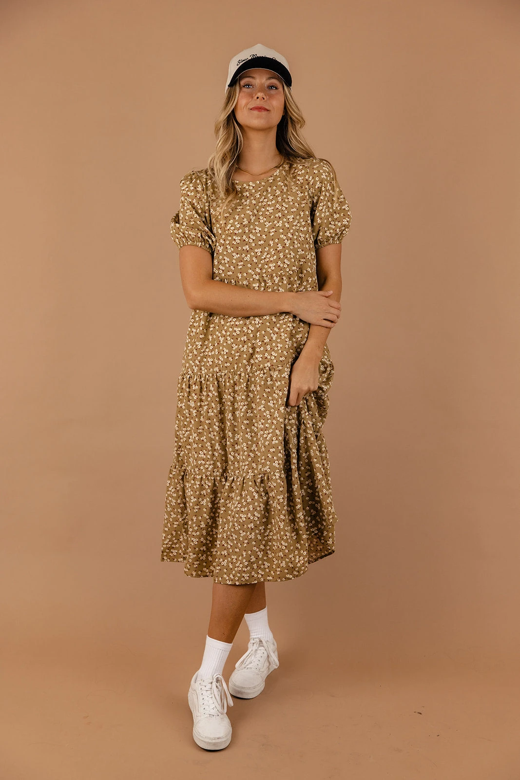 The Uncharted Floral Dress features a round neckline, puff sleeves, and a midi length. We love it paired with your favorite sneakers and a cute ballcap for those casual summer days.