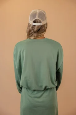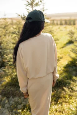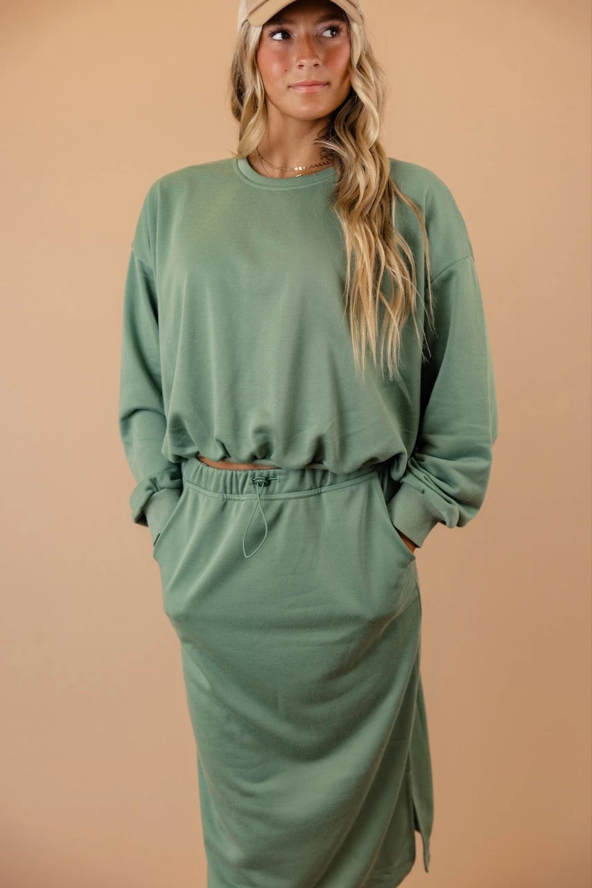 Both versatile and comfortable, this take on the classic pullover features a relaxed fit with a gathered waist and drop-shoulder full-length sleeves. With a waistband designed to fit not too high or low–but just right, this pullover can be worn with bottoms of choice, or paired with the matching skirt.
