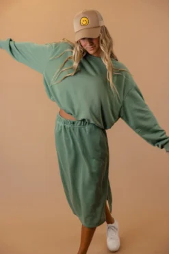 // paired with the years ago french terry skirt, the vacation club canvas trucker hat in darkgreen + the smiley trucker hat in khaki